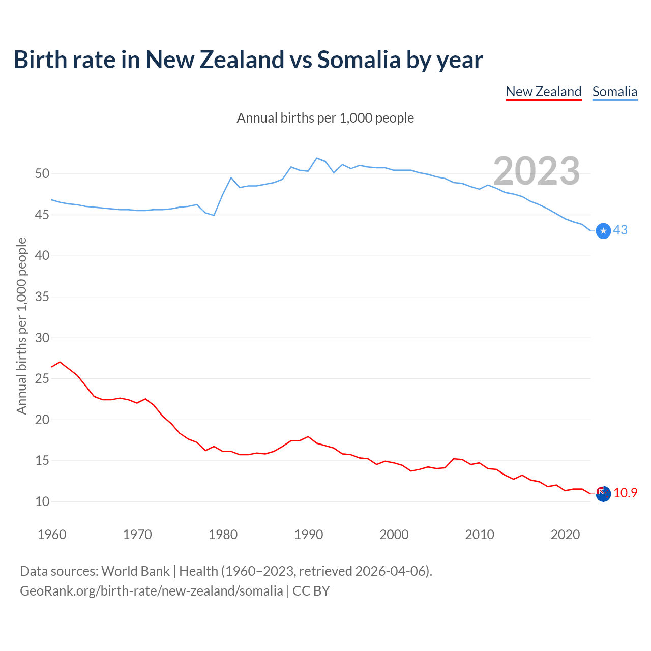 New Zealand has an annual birth rate of 10.9 births per 1,000 people, compared to 43 for Somalia. The average number of children a woman is expected to have during her lifetime — the fertility rate, is 1.56 in New Zealand and 6.13 in Somalia — 293.1% difference.