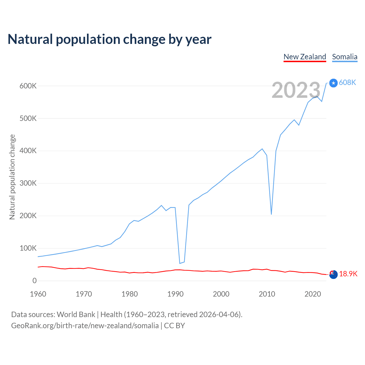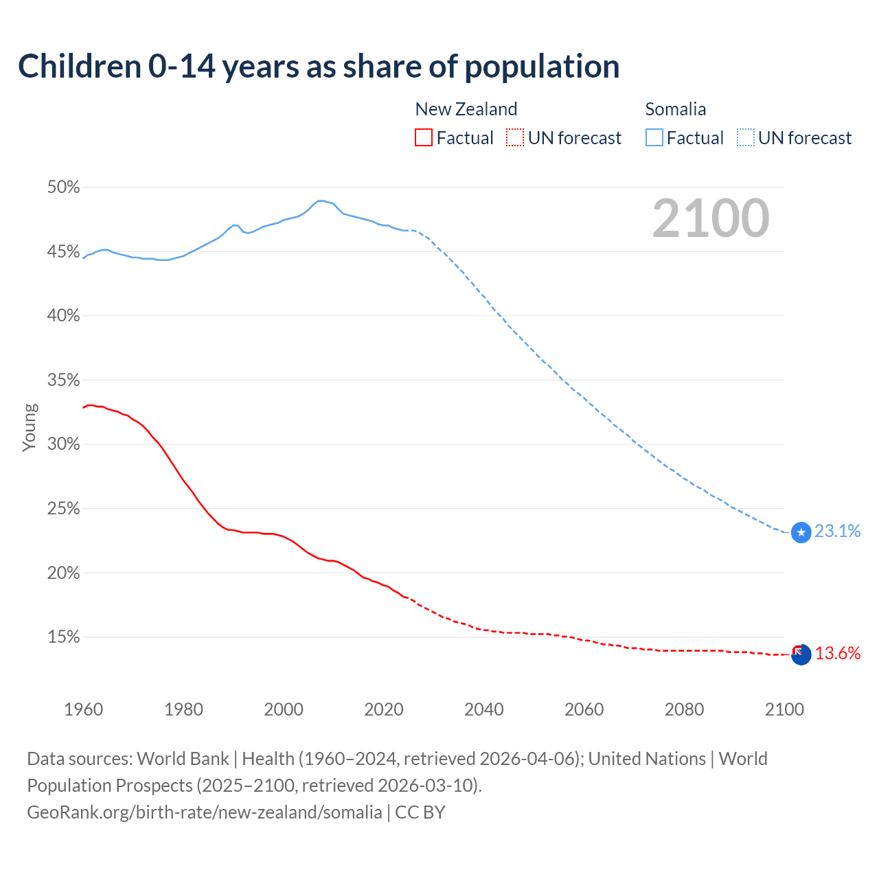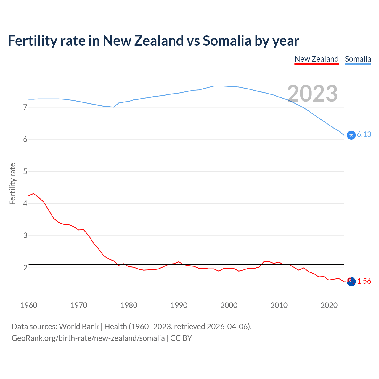According to the latest available data on birth rates, the fertility rate in New Zealand was 1.56 children per woman in 2023, compared to 6.13 in Somalia in 2023. The replacement level is considered to be 2.1 children per woman.