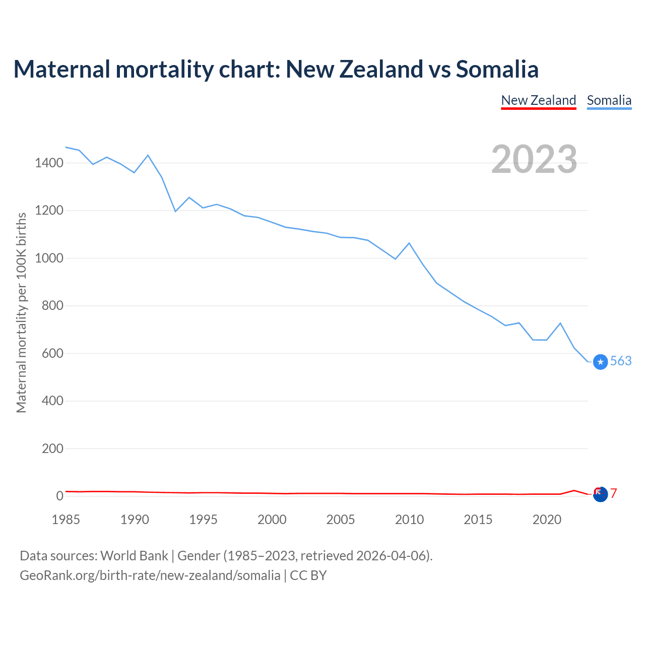 The maternal mortality rate, which is the probability of dying during childbirth or within 42 days of pregnancy termination, is 7 deaths per 100,000 live births in New Zealand, compared to 563 deaths in Somalia.