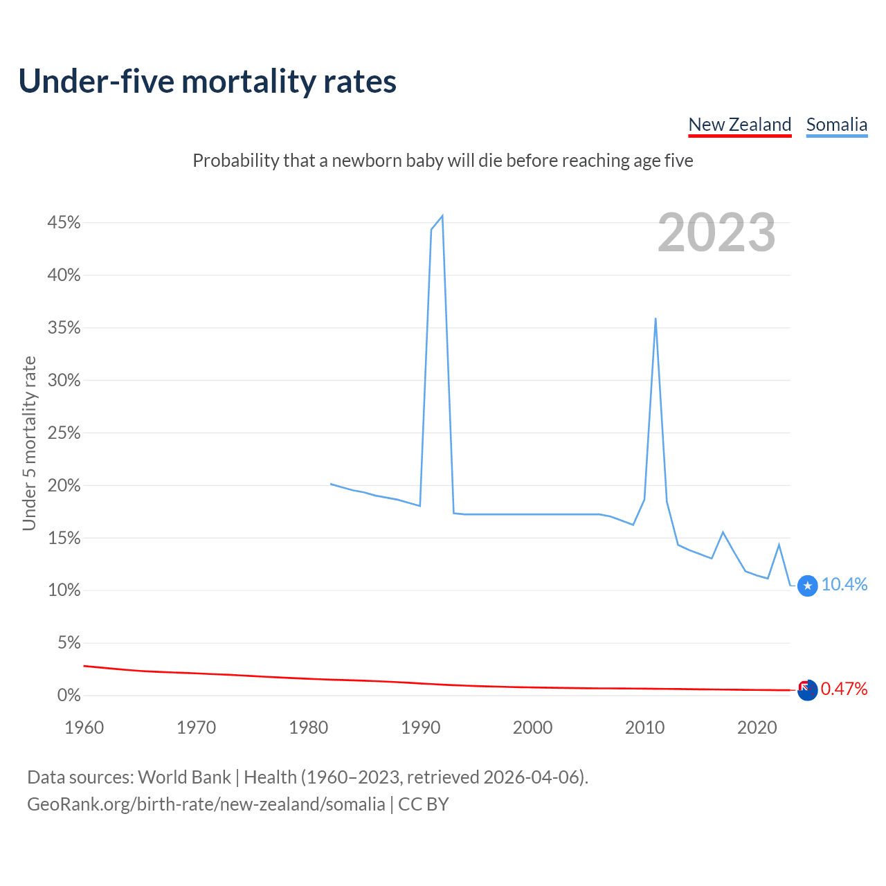 The chance that a newborn baby will die before reaching age five is 0.47% in New Zealand and 10.4% in Somalia. Above is a chart with historical data on under-five mortality rates.