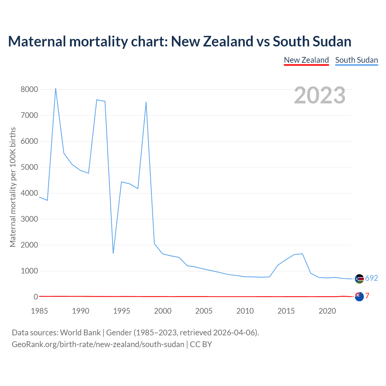 The maternal mortality rate, which is the probability of dying during childbirth or within 42 days of pregnancy termination, is 7 deaths per 100,000 live births in New Zealand, compared to 692 deaths in South Sudan.