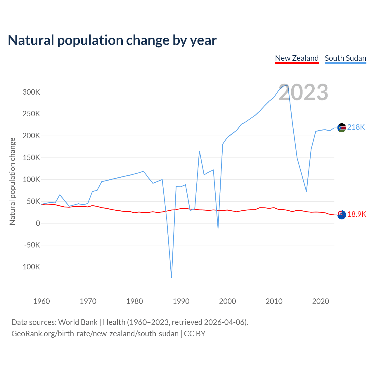 New Zealand has an annual birth rate of 10.9 births per 1,000 people, compared to 28.6 for South Sudan. The average number of children a woman is expected to have during her lifetime — the fertility rate, is 1.56 in New Zealand and 3.86 in South Sudan — 147.7% difference.