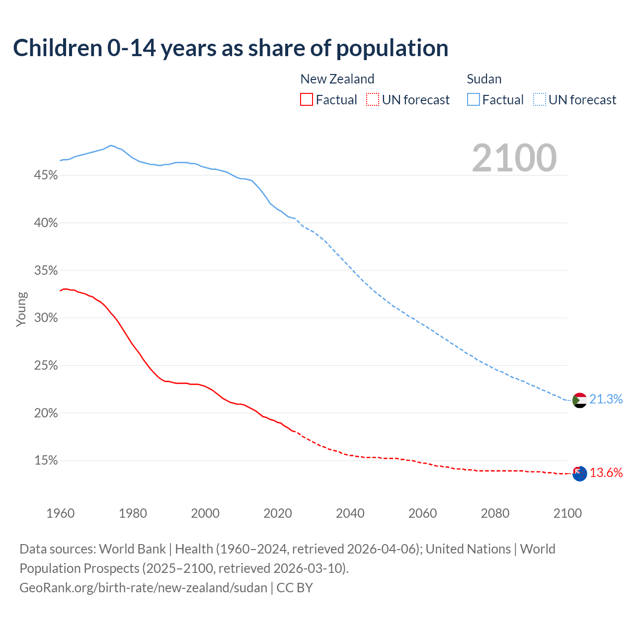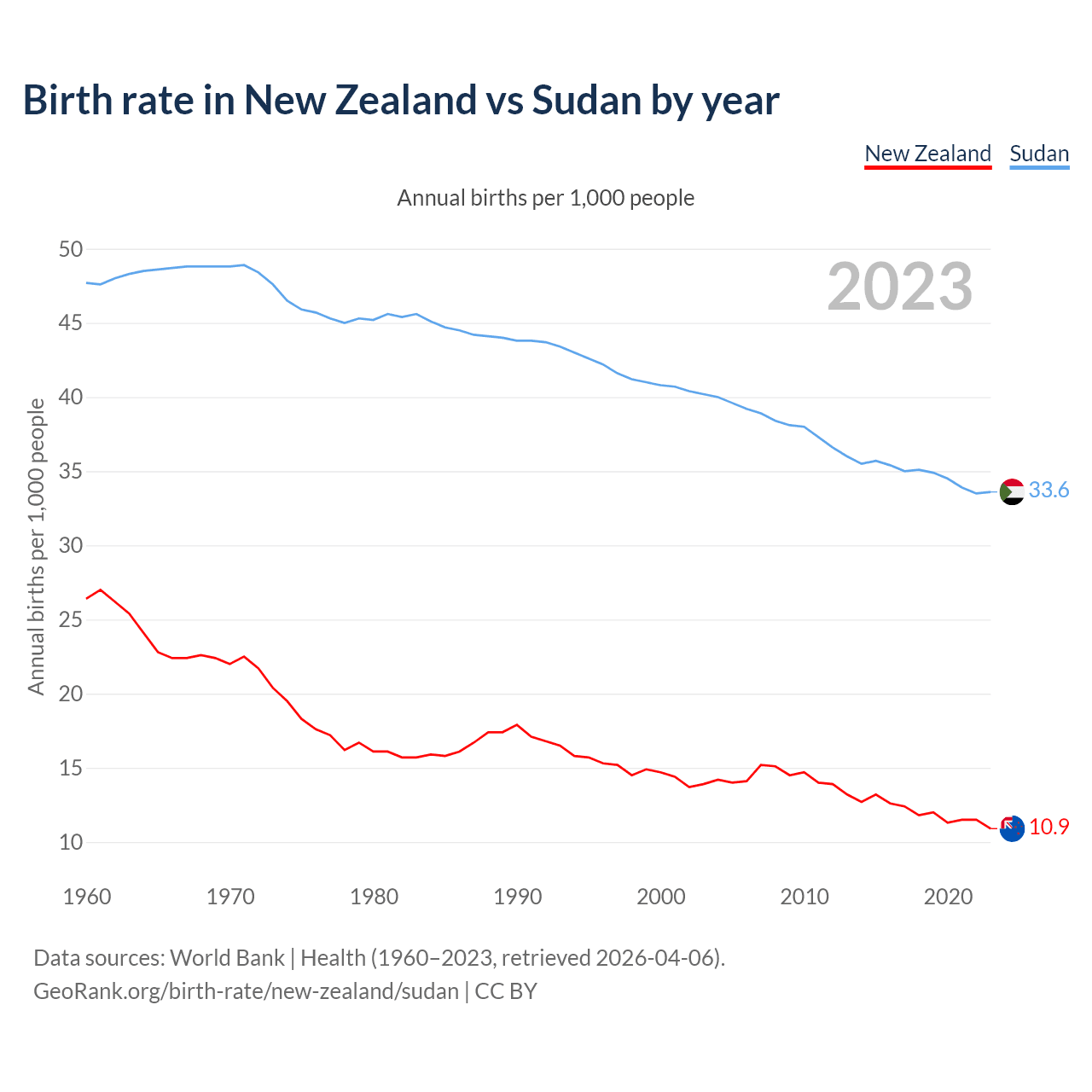 New Zealand has an annual birth rate of 10.9 births per 1,000 people, compared to 33.6 for Sudan. The average number of children a woman is expected to have during her lifetime — the fertility rate, is 1.56 in New Zealand and 4.32 in Sudan — 177.1% difference.