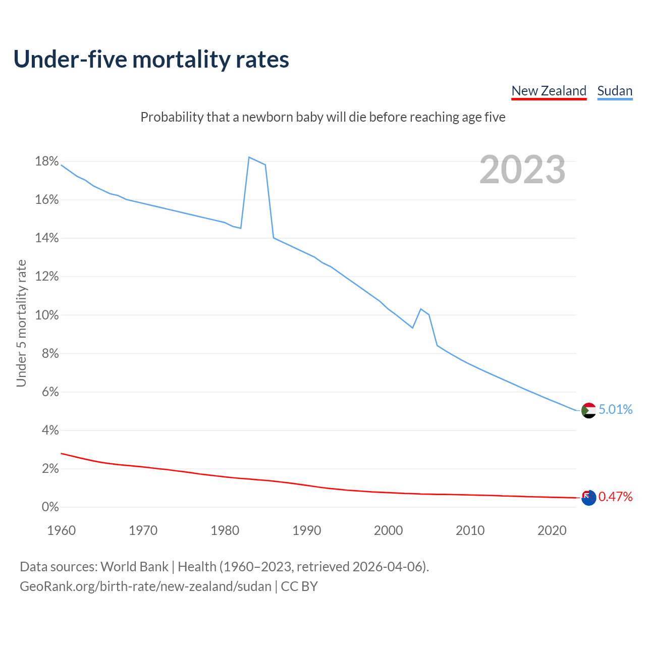 The chance that a newborn baby will die before reaching age five is 0.47% in New Zealand and 5.01% in Sudan. Above is a chart with historical data on under-five mortality rates.
