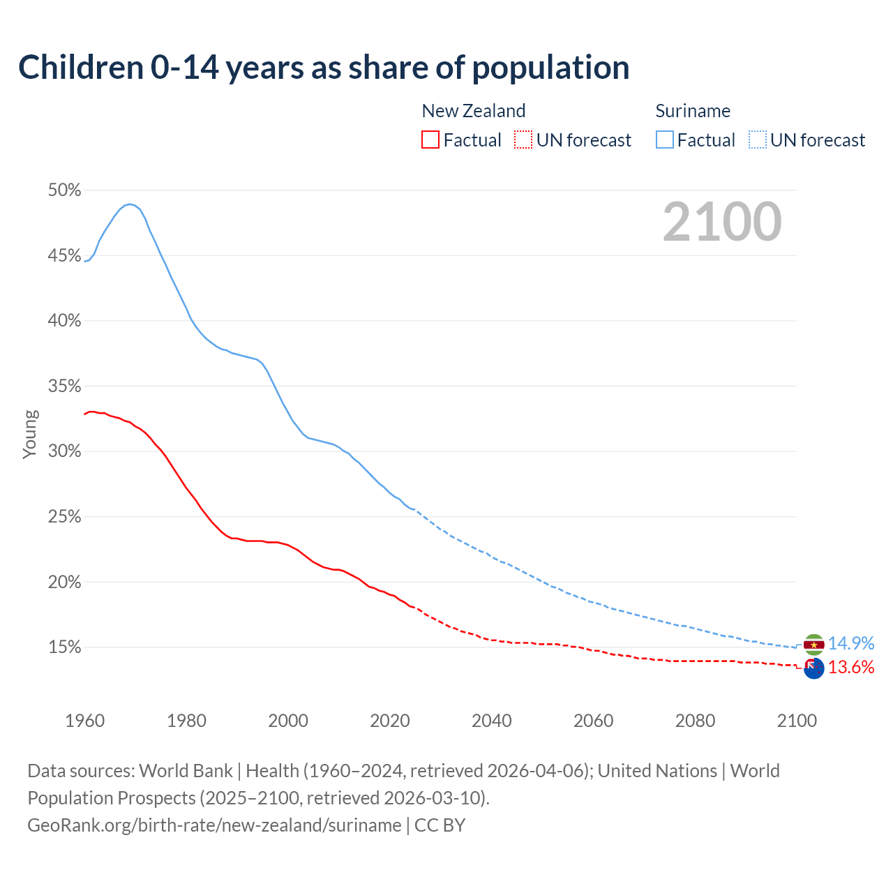 According to the latest available data on birth rates, the fertility rate in New Zealand was 1.56 children per woman in 2023, compared to 2.25 in Suriname in 2023. The replacement level is considered to be 2.1 children per woman.