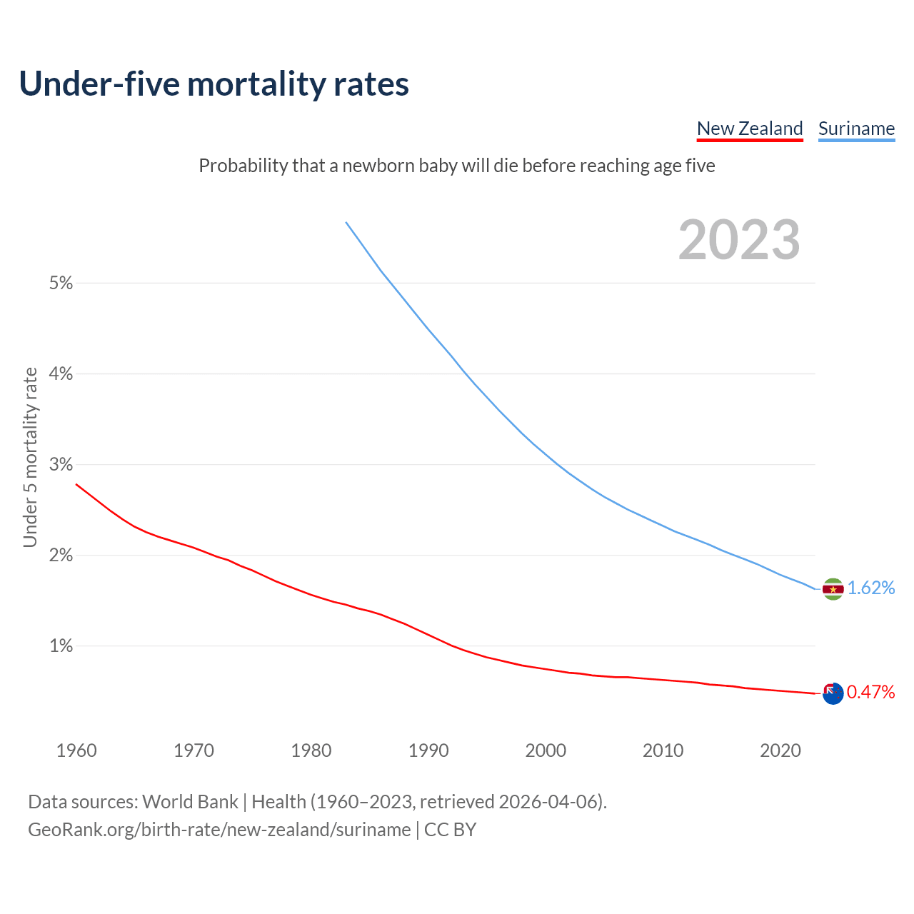 The chance that a newborn baby will die before reaching age five is 0.47% in New Zealand and 1.62% in Suriname. Above is a chart with historical data on under-five mortality rates.
