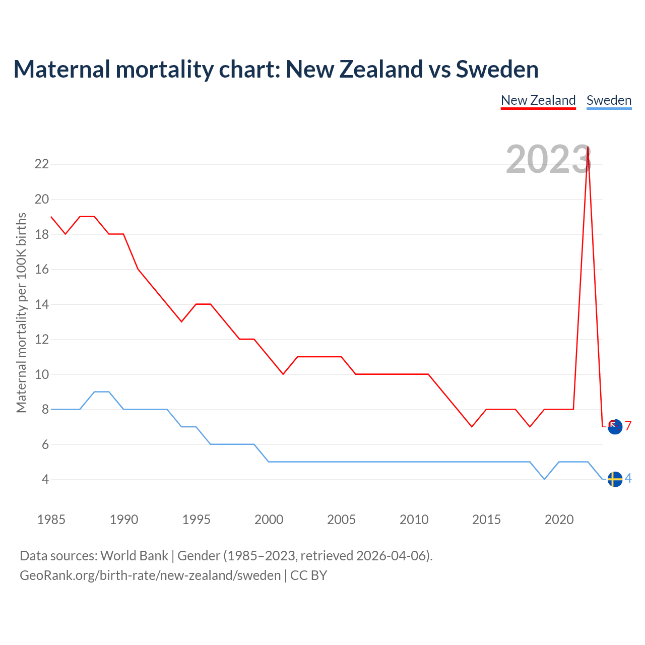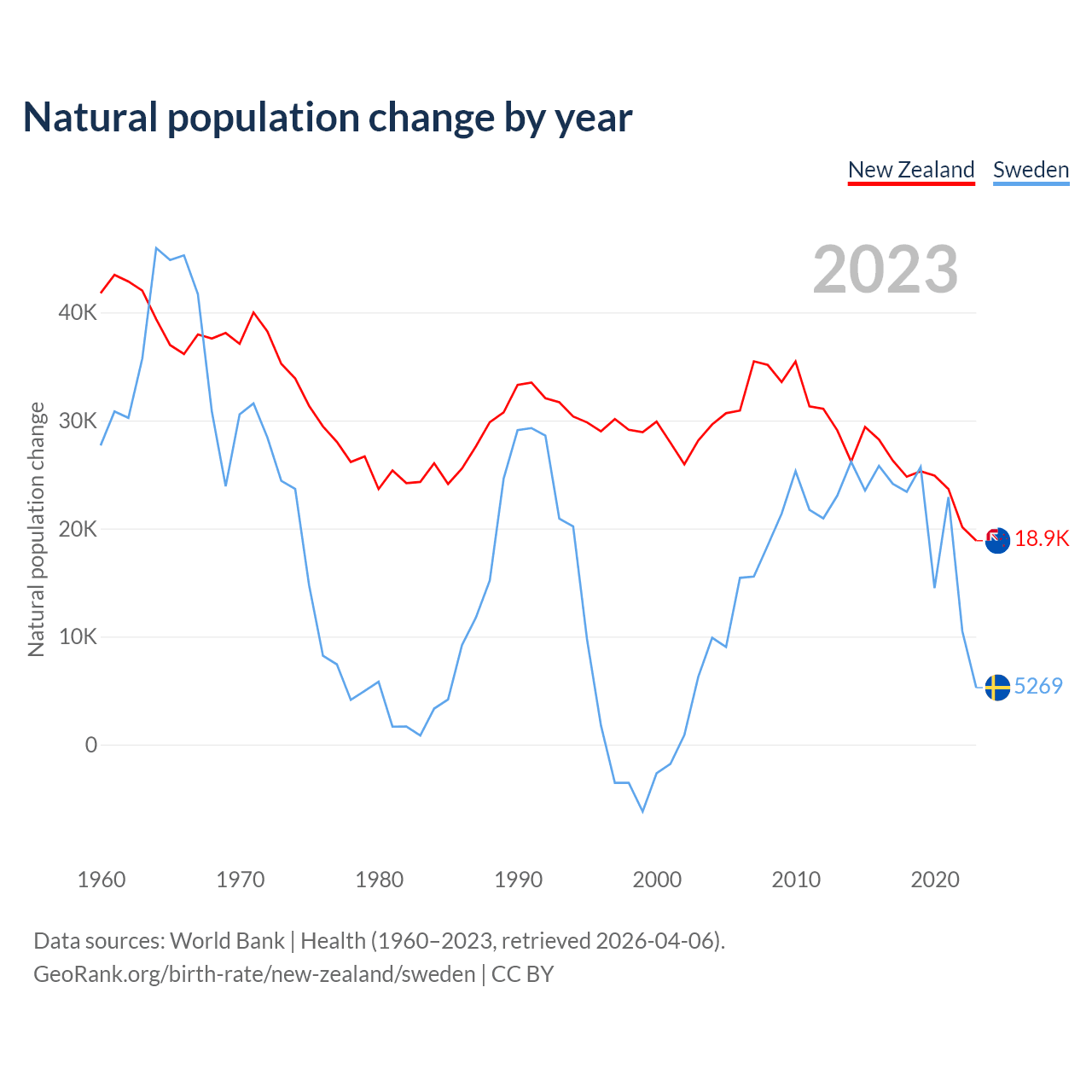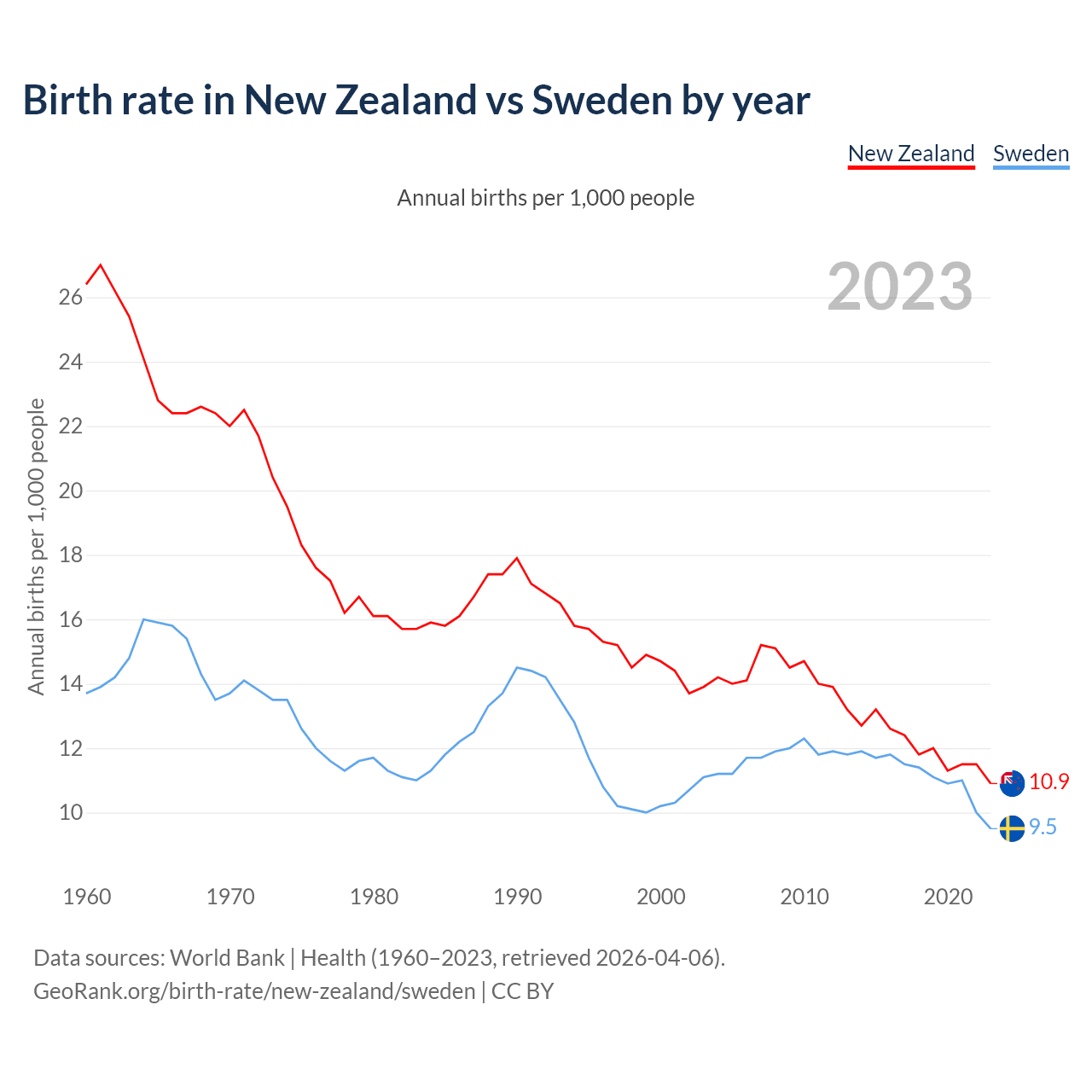 According to the latest available data on birth rates, the fertility rate in New Zealand was 1.56 children per woman in 2023, compared to 1.45 in Sweden in 2023. The replacement level is considered to be 2.1 children per woman.
