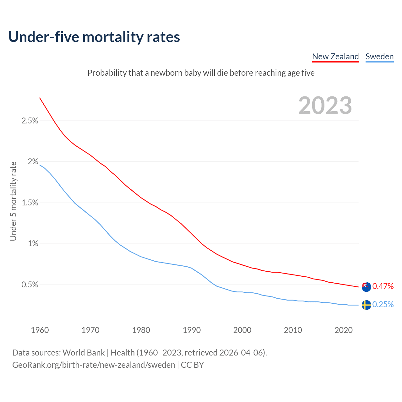 The chance that a newborn baby will die before reaching age five is 0.47% in New Zealand and 0.25% in Sweden. Above is a chart with historical data on under-five mortality rates.