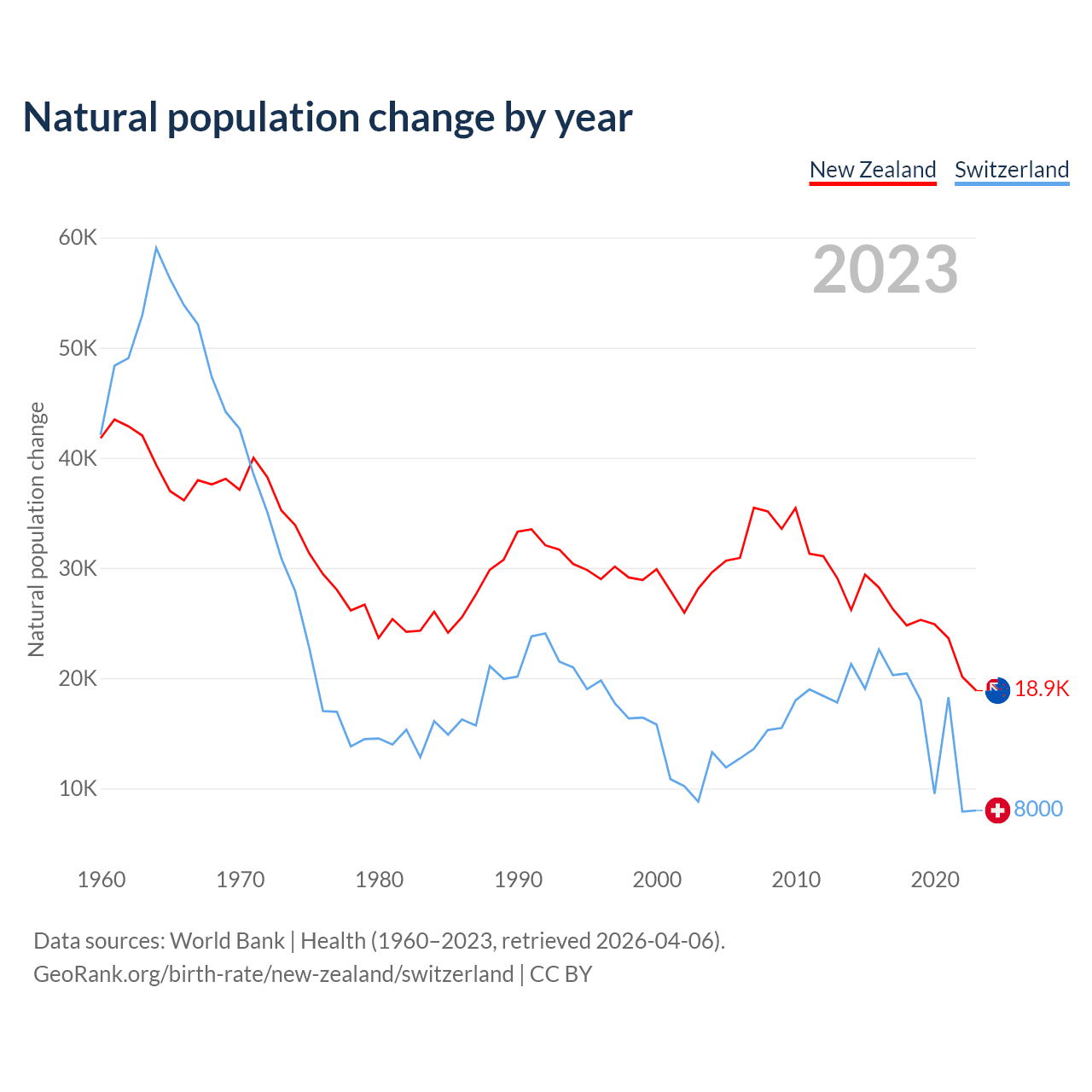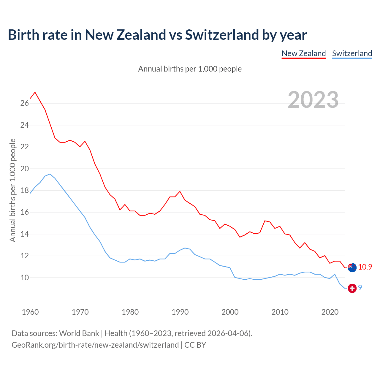 New Zealand has an annual birth rate of 10.9 births per 1,000 people, compared to 9 for Switzerland. The average number of children a woman is expected to have during her lifetime — the fertility rate, is 1.56 in New Zealand and 1.33 in Switzerland — 14.7% difference.