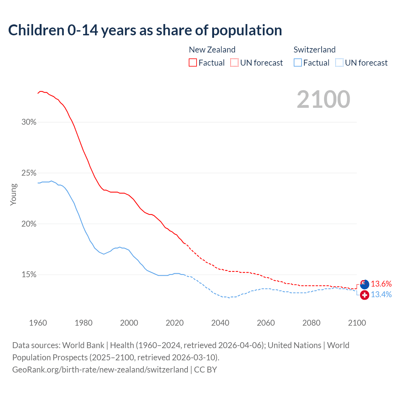 According to the latest available data on birth rates, the fertility rate in New Zealand was 1.56 children per woman in 2023, compared to 1.33 in Switzerland in 2023. The replacement level is considered to be 2.1 children per woman.