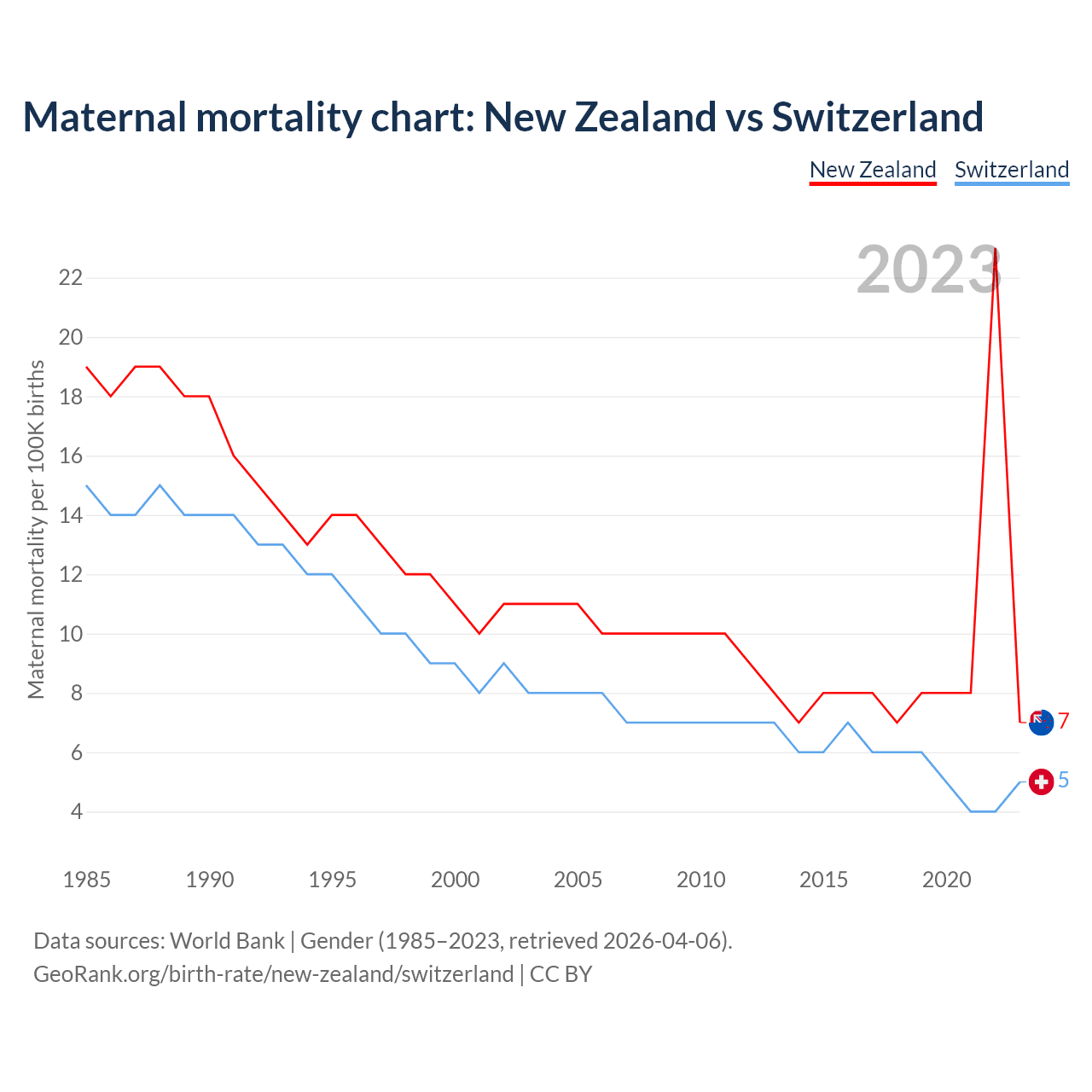 The maternal mortality rate, which is the probability of dying during childbirth or within 42 days of pregnancy termination, is 7 deaths per 100,000 live births in New Zealand, compared to 5 deaths in Switzerland.