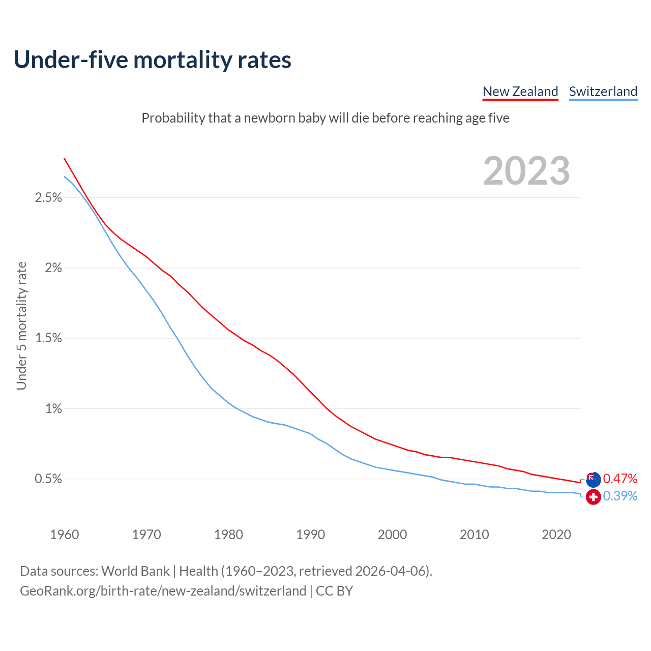 The chance that a newborn baby will die before reaching age five is 0.47% in New Zealand and 0.39% in Switzerland. Above is a chart with historical data on under-five mortality rates.