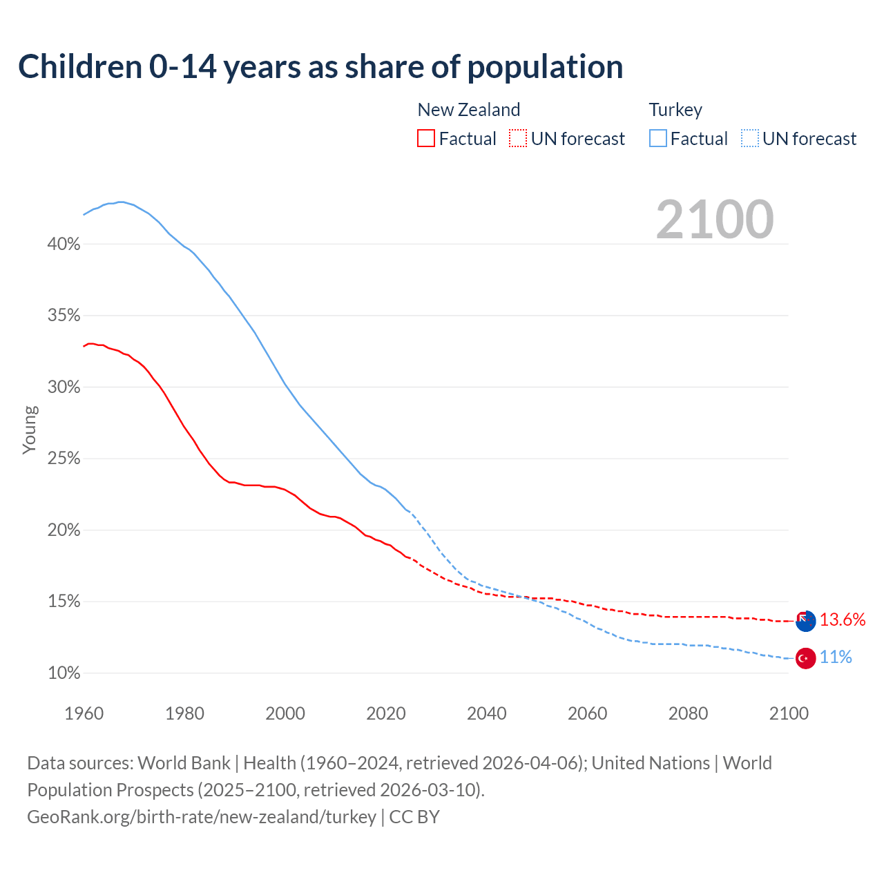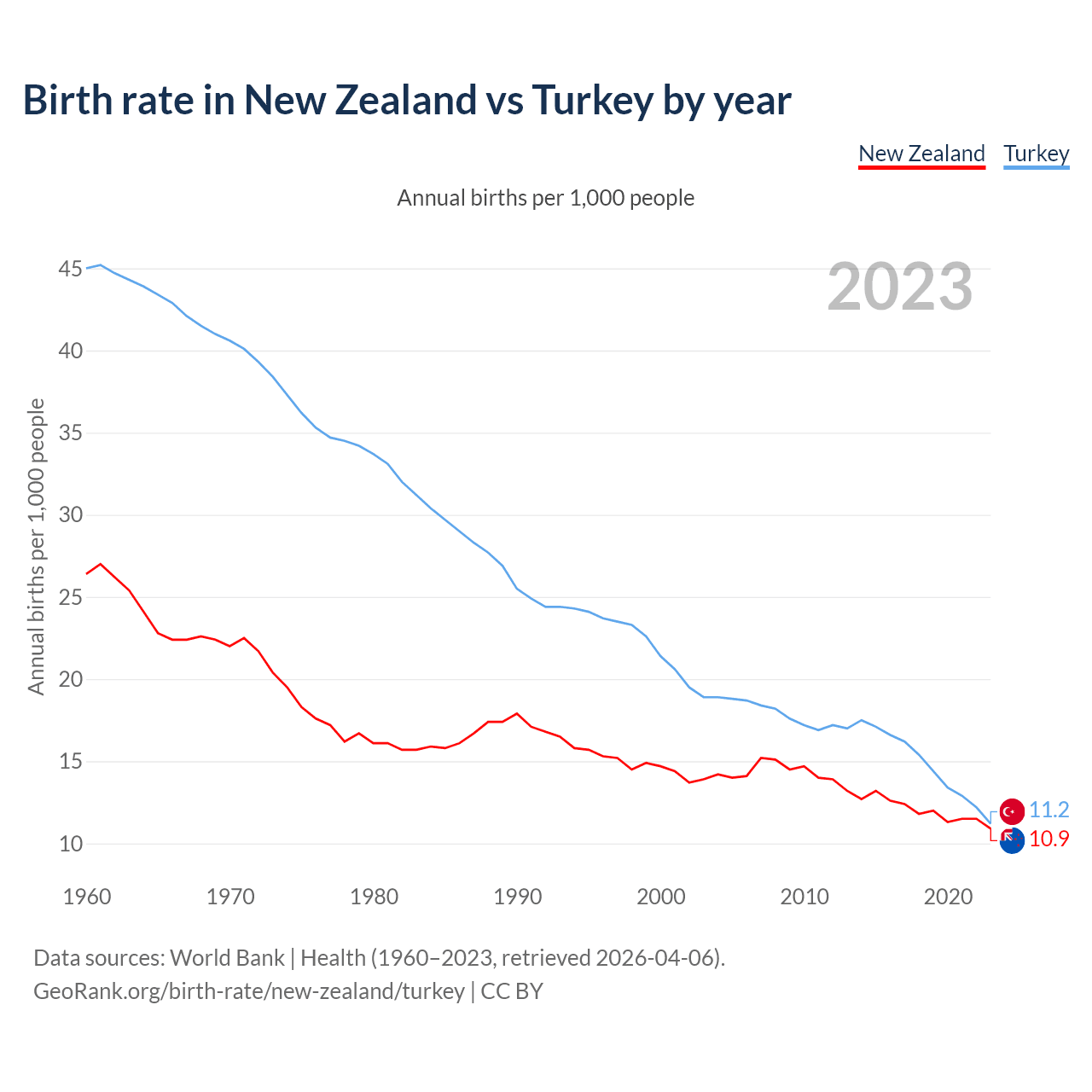 According to the latest available data on birth rates, the fertility rate in New Zealand was 1.56 children per woman in 2023, compared to 1.51 in Turkey in 2023. The replacement level is considered to be 2.1 children per woman.
