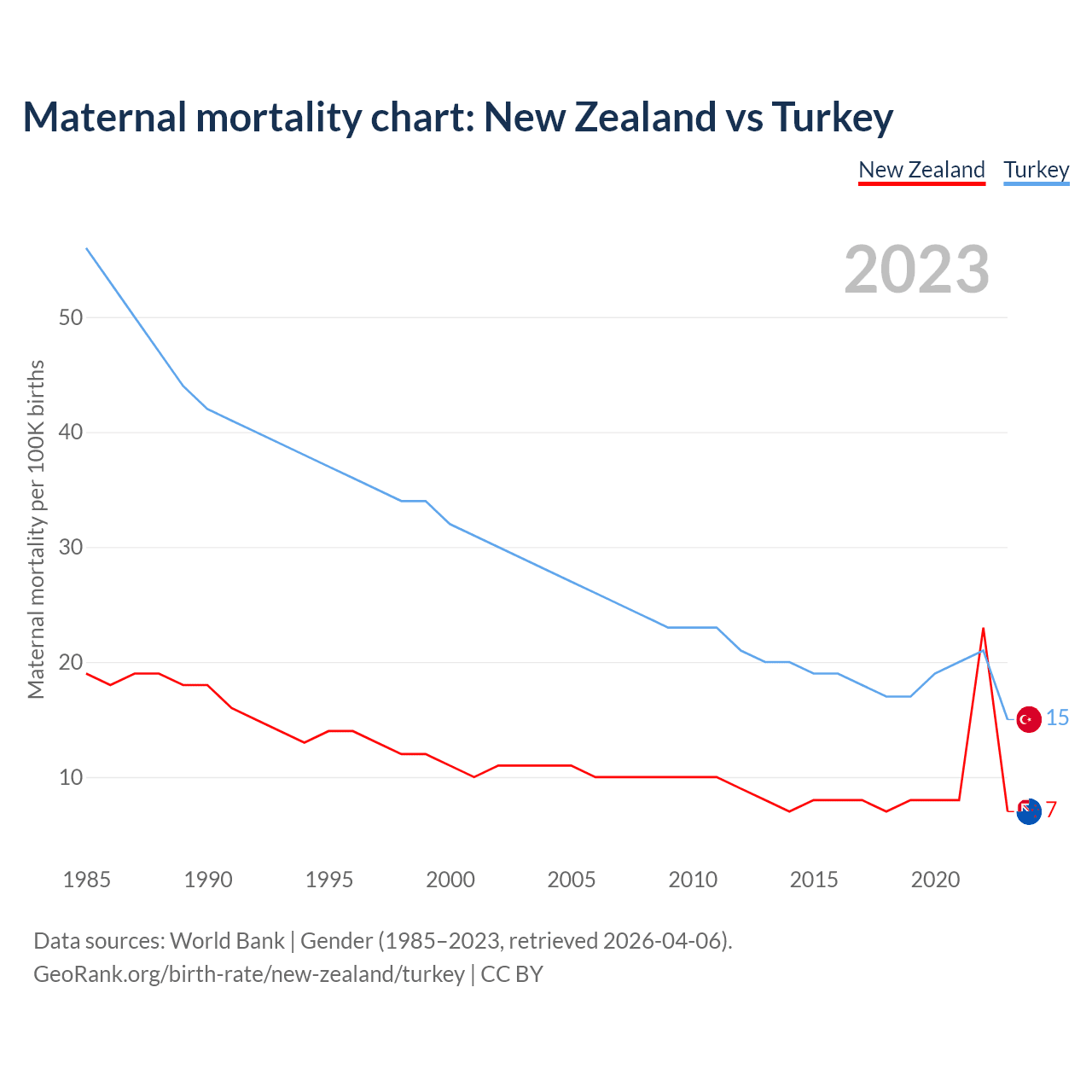 The maternal mortality rate, which is the probability of dying during childbirth or within 42 days of pregnancy termination, is 7 deaths per 100,000 live births in New Zealand, compared to 15 deaths in Turkey.