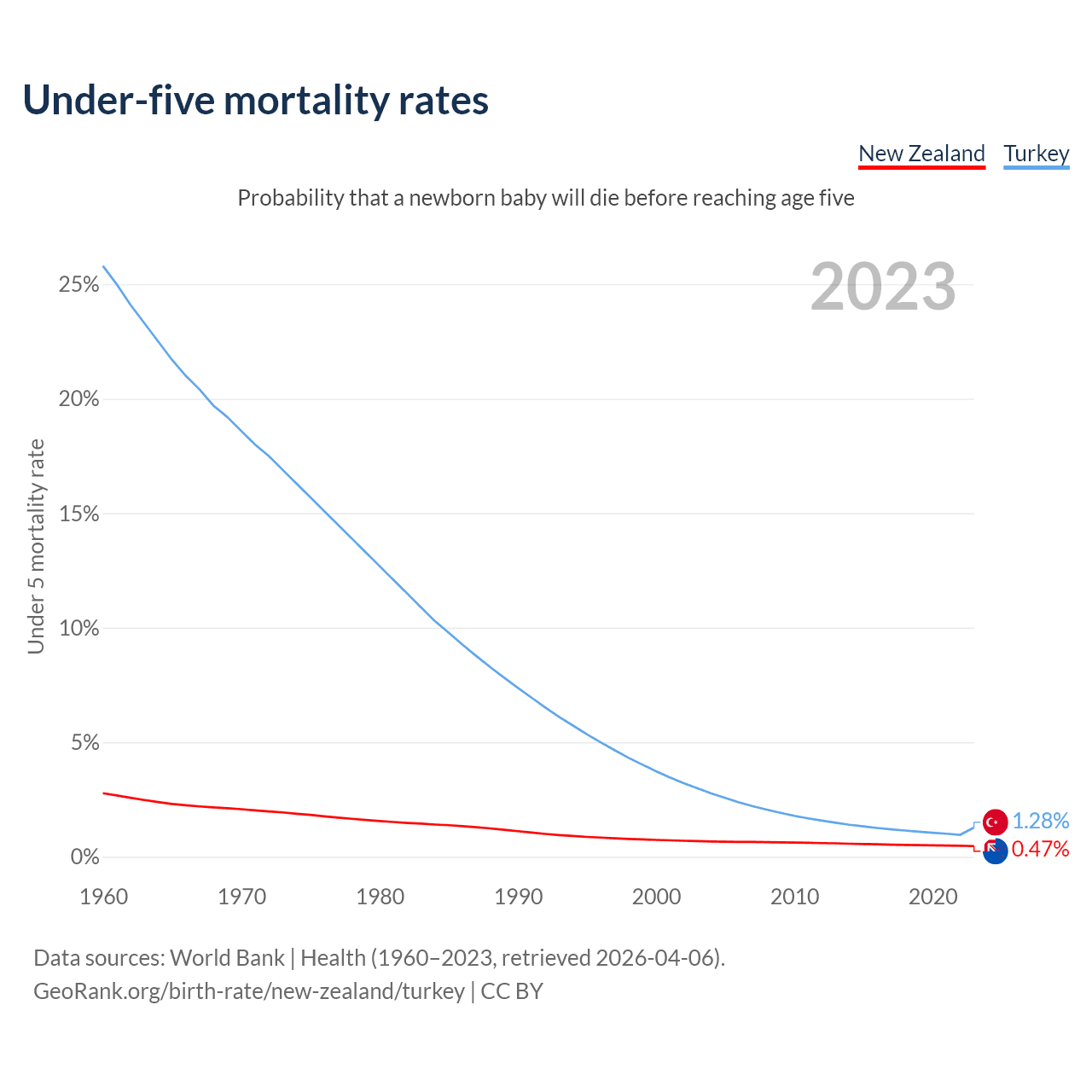 The chance that a newborn baby will die before reaching age five is 0.47% in New Zealand and 1.28% in Turkey. Above is a chart with historical data on under-five mortality rates.