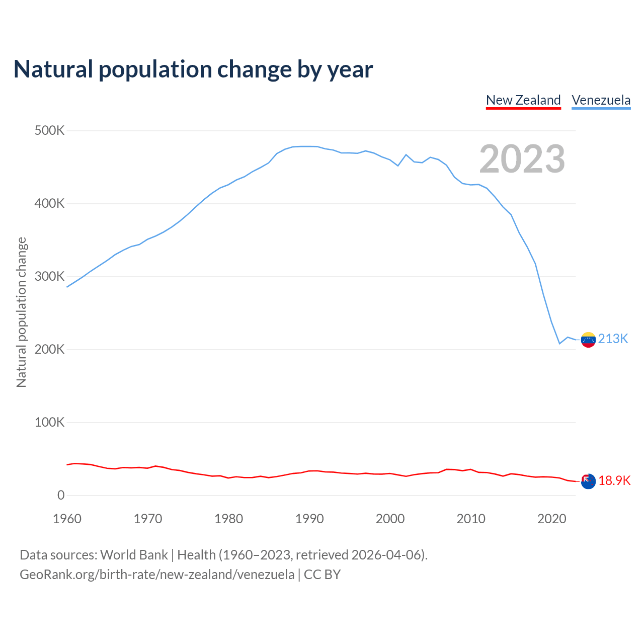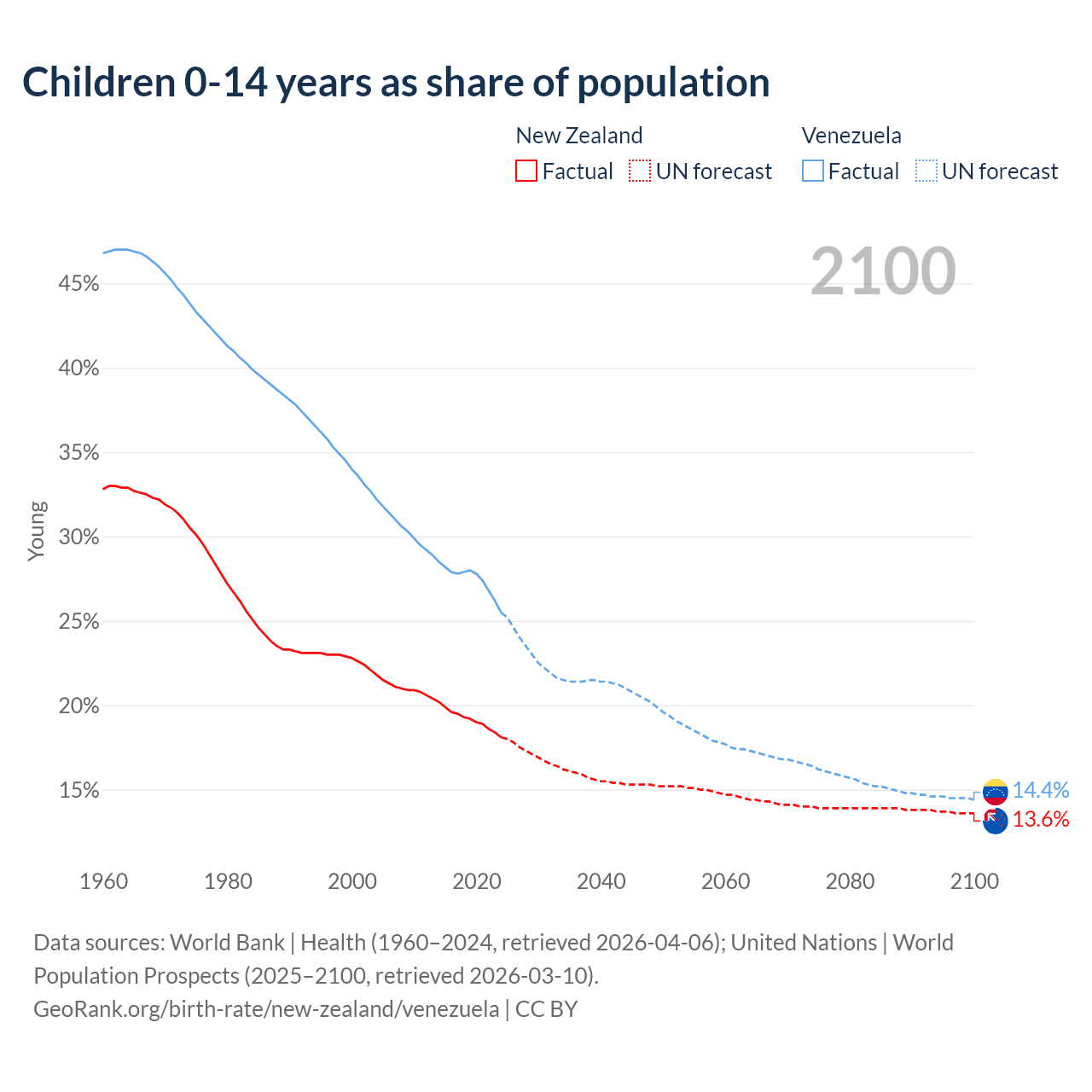 According to the latest available data on birth rates, the fertility rate in New Zealand was 1.56 children per woman in 2023, compared to 2.08 in Venezuela in 2023. The replacement level is considered to be 2.1 children per woman.