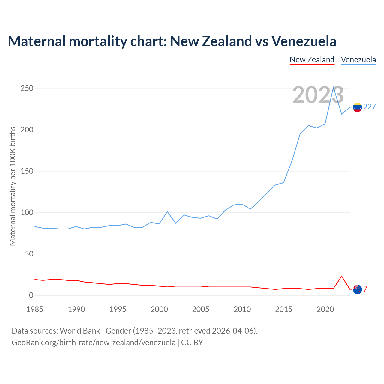 The maternal mortality rate, which is the probability of dying during childbirth or within 42 days of pregnancy termination, is 7 deaths per 100,000 live births in New Zealand, compared to 227 deaths in Venezuela.