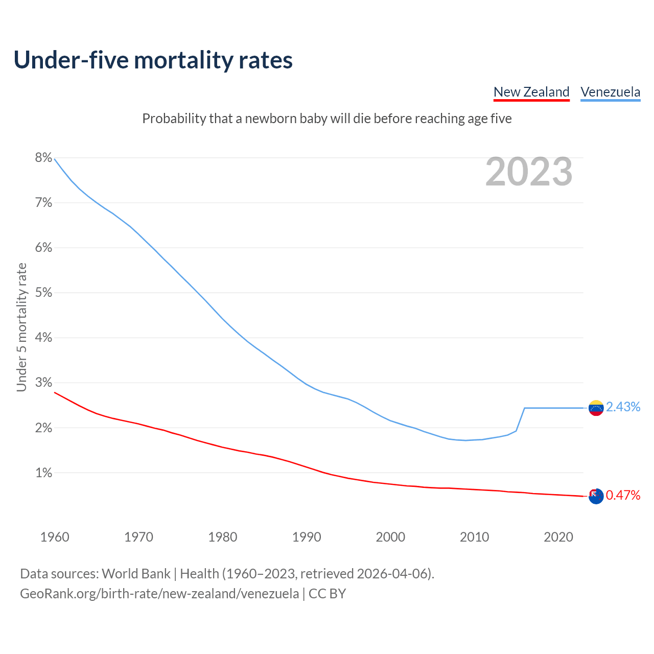 The chance that a newborn baby will die before reaching age five is 0.47% in New Zealand and 2.43% in Venezuela. Above is a chart with historical data on under-five mortality rates.