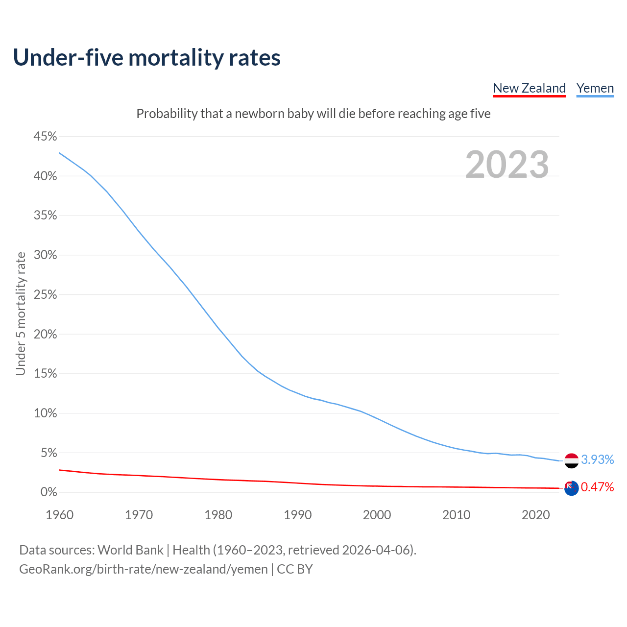 The chance that a newborn baby will die before reaching age five is 0.47% in New Zealand and 3.93% in Yemen. Above is a chart with historical data on under-five mortality rates.