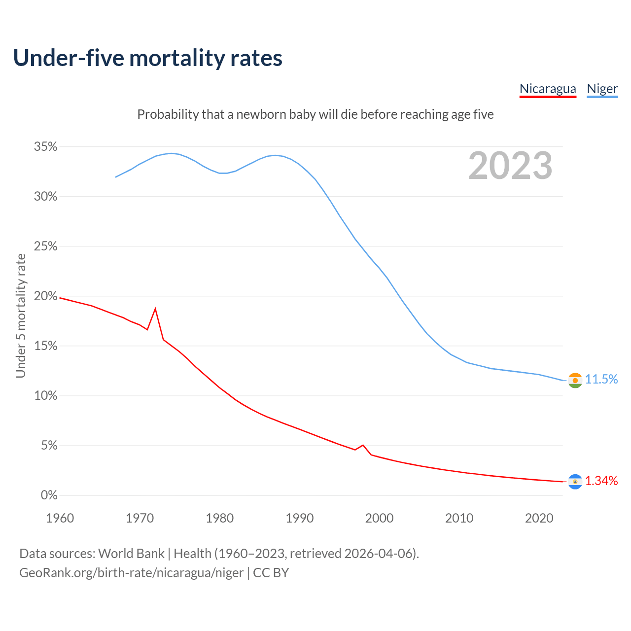 The chance that a newborn baby will die before reaching age five is 1.34% in Nicaragua and 11.5% in Niger. Above is a chart with historical data on under-five mortality rates.
