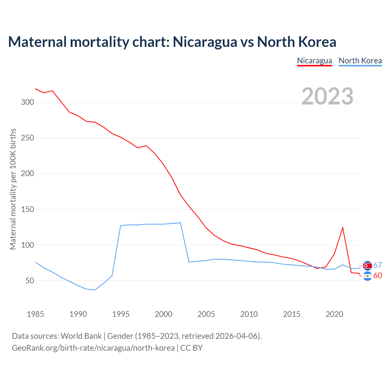The maternal mortality rate, which is the probability of dying during childbirth or within 42 days of pregnancy termination, is 60 deaths per 100,000 live births in Nicaragua, compared to 67 deaths in North Korea.