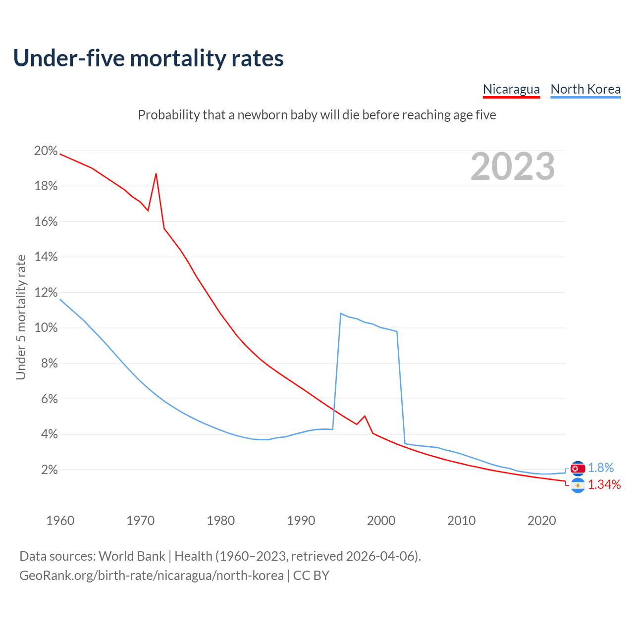 The chance that a newborn baby will die before reaching age five is 1.34% in Nicaragua and 1.8% in North Korea. Above is a chart with historical data on under-five mortality rates.