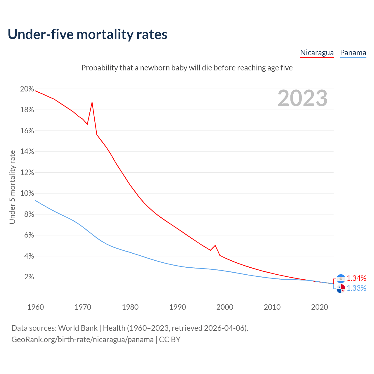 The chance that a newborn baby will die before reaching age five is 1.34% in Nicaragua and 1.33% in Panama. Above is a chart with historical data on under-five mortality rates.