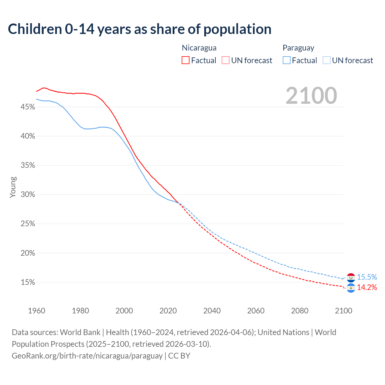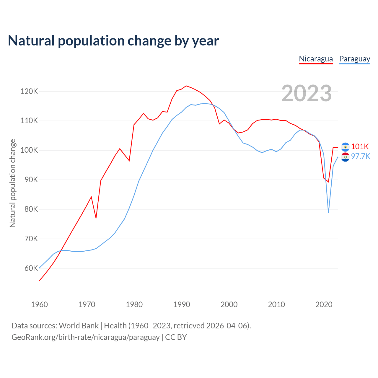 According to the latest available data on birth rates, the fertility rate in Nicaragua was 2.22 children per woman in 2023, compared to 2.42 in Paraguay in 2023. The replacement level is considered to be 2.1 children per woman.