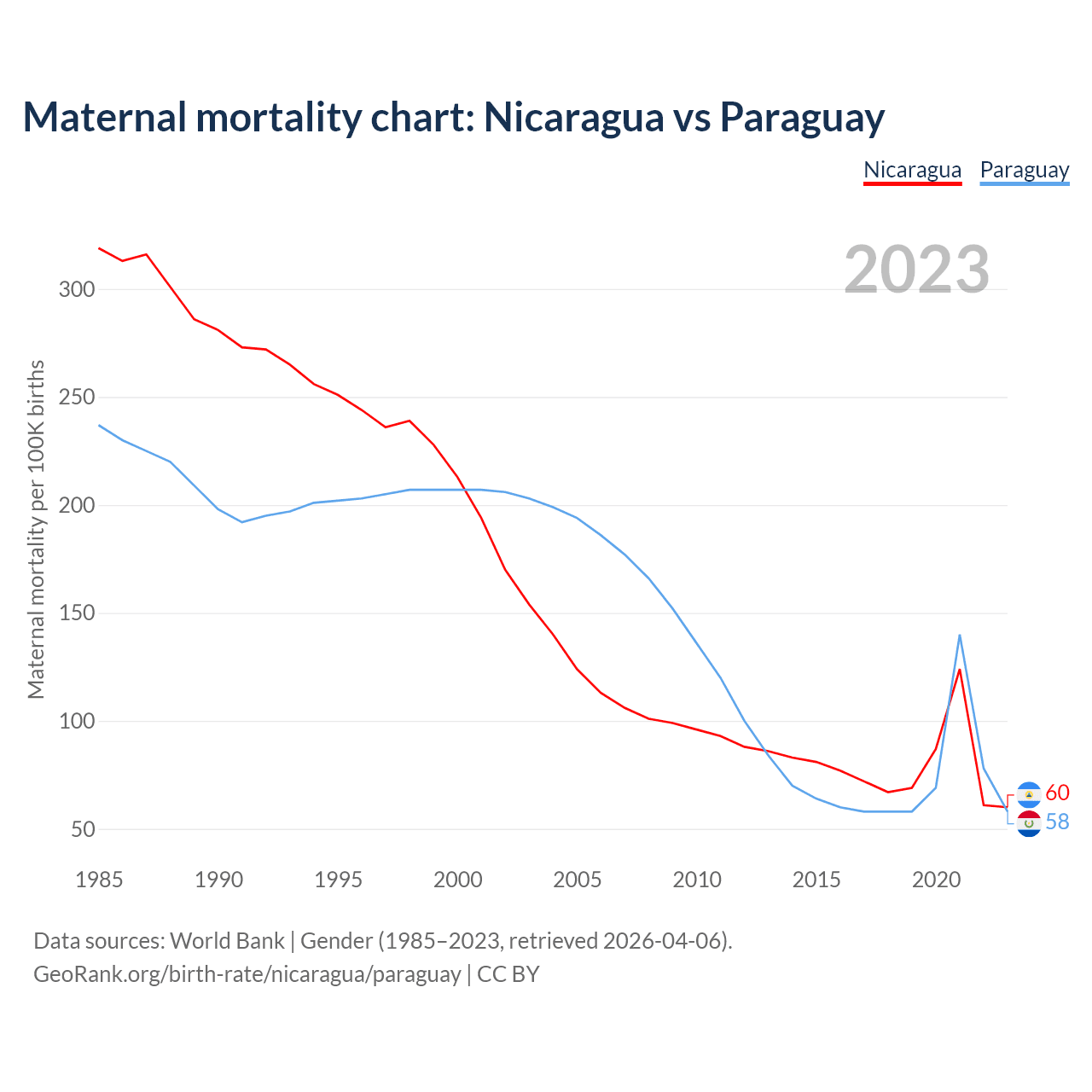 The maternal mortality rate, which is the probability of dying during childbirth or within 42 days of pregnancy termination, is 60 deaths per 100,000 live births in Nicaragua, compared to 58 deaths in Paraguay.