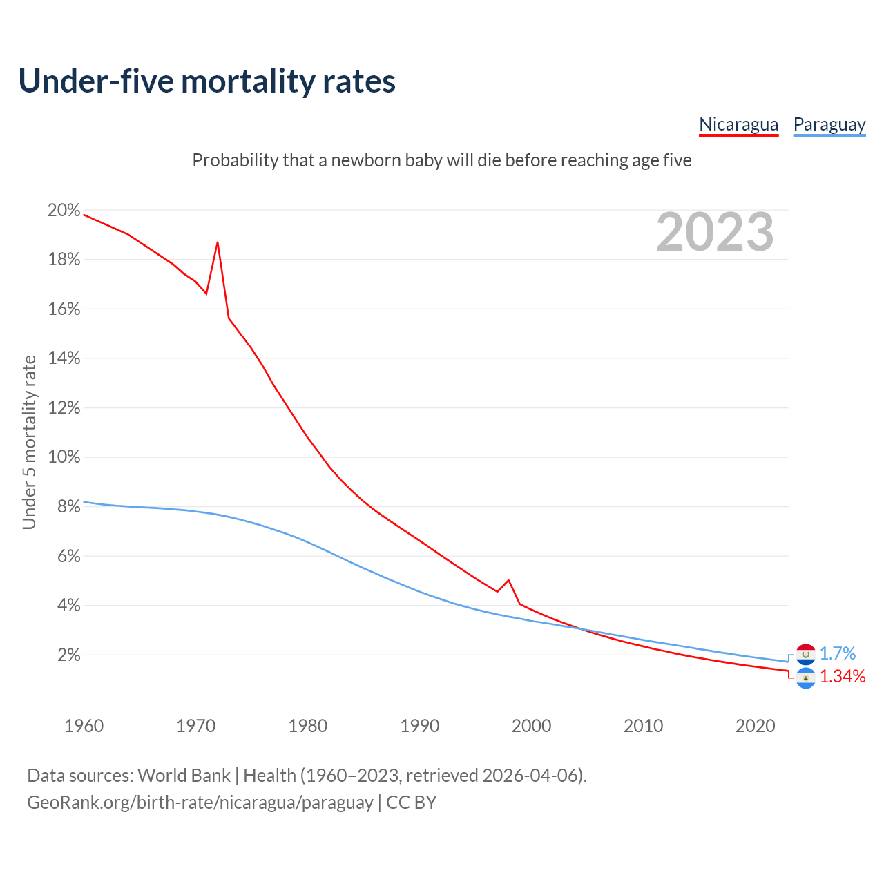 The chance that a newborn baby will die before reaching age five is 1.34% in Nicaragua and 1.7% in Paraguay. Above is a chart with historical data on under-five mortality rates.