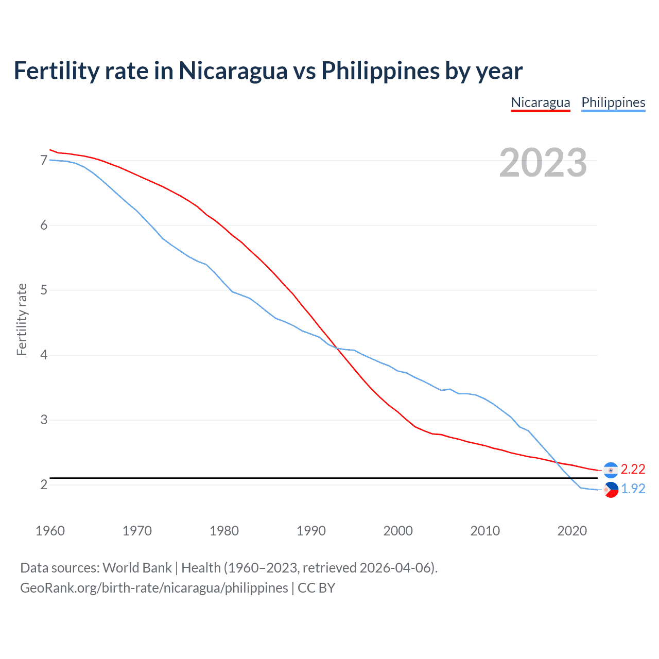 According to the latest available data on birth rates, the fertility rate in Nicaragua was 2.22 children per woman in 2023, compared to 1.92 in the Philippines in 2023. The replacement level is considered to be 2.1 children per woman.