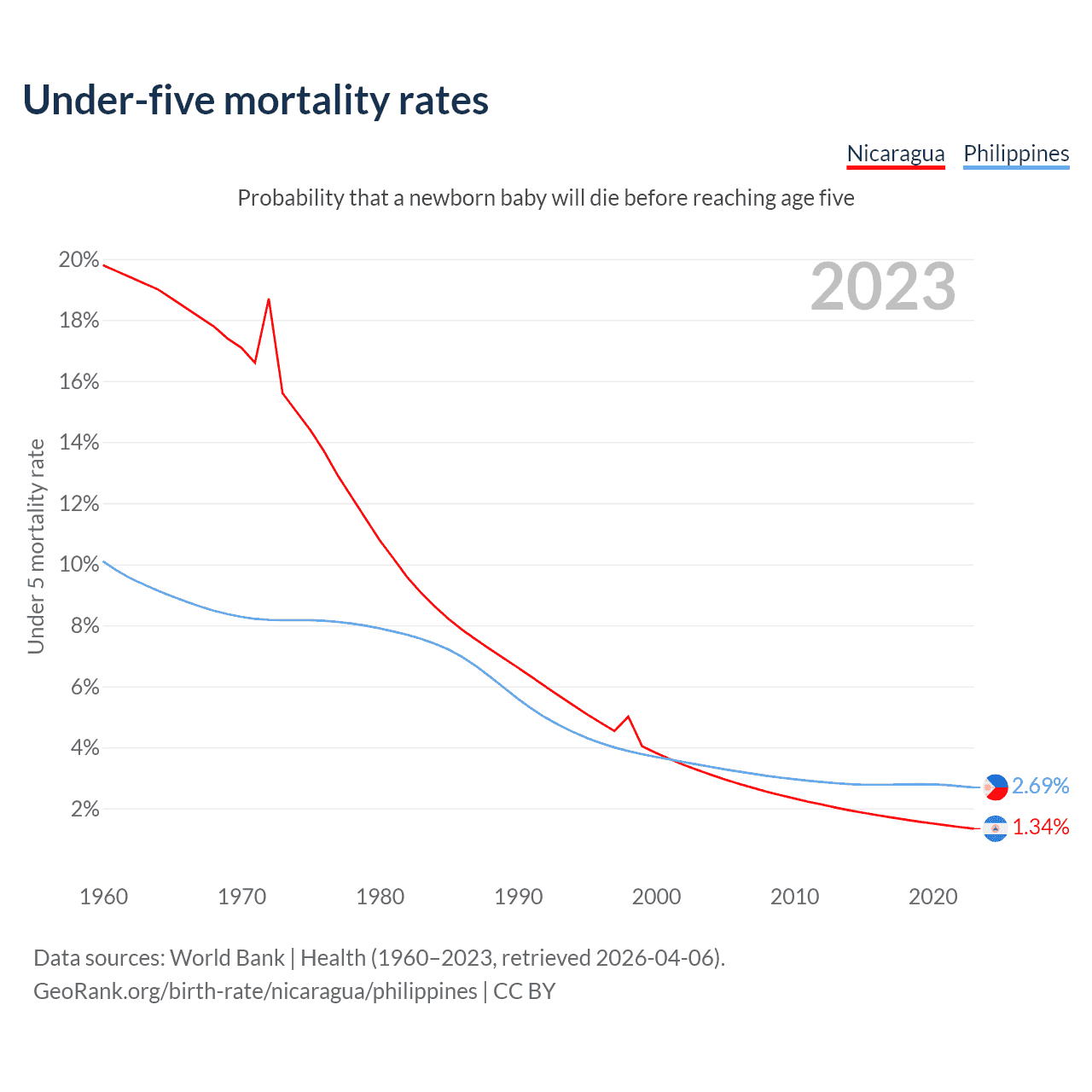 The chance that a newborn baby will die before reaching age five is 1.34% in Nicaragua and 2.69% in the Philippines. Above is a chart with historical data on under-five mortality rates.