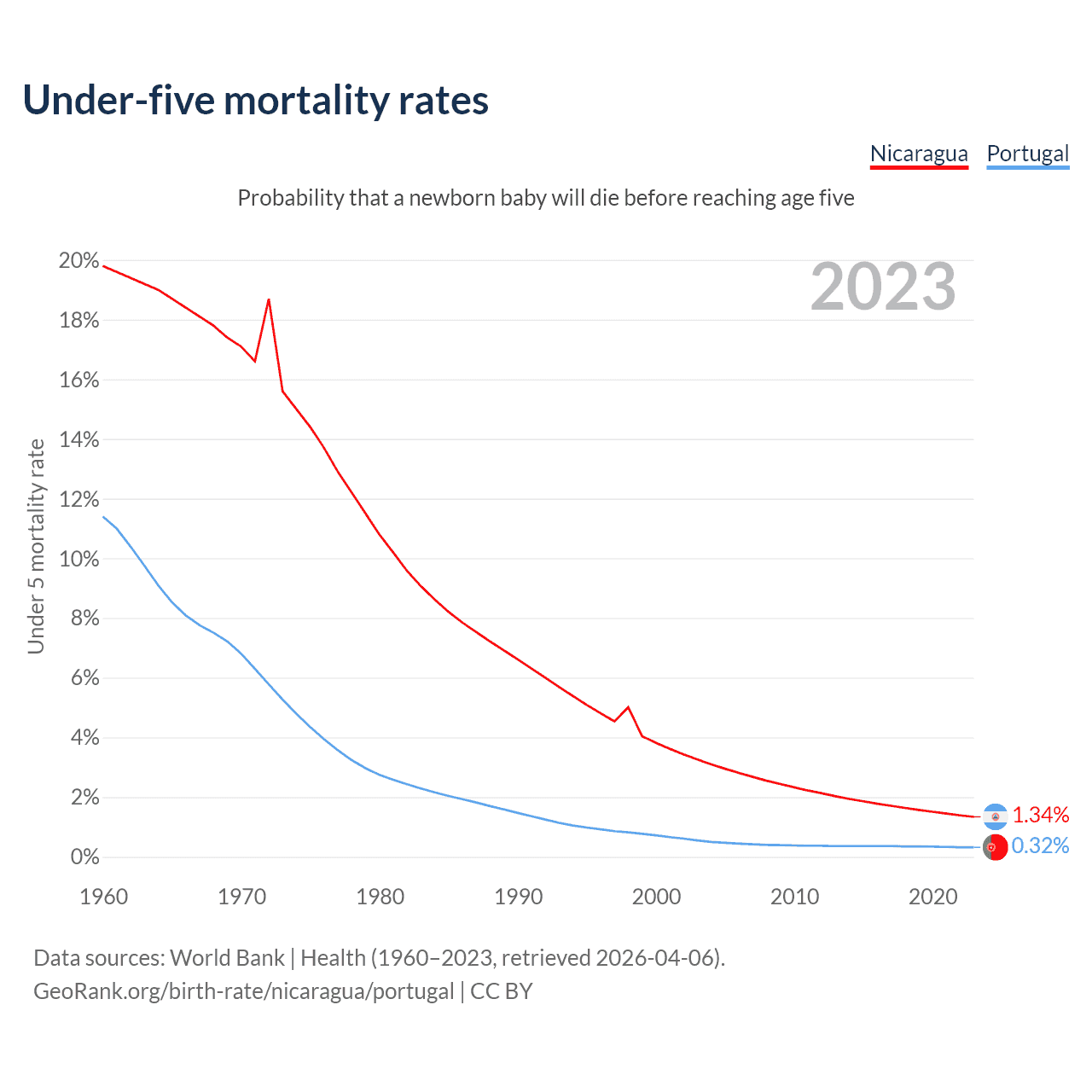 The chance that a newborn baby will die before reaching age five is 1.34% in Nicaragua and 0.32% in Portugal. Above is a chart with historical data on under-five mortality rates.