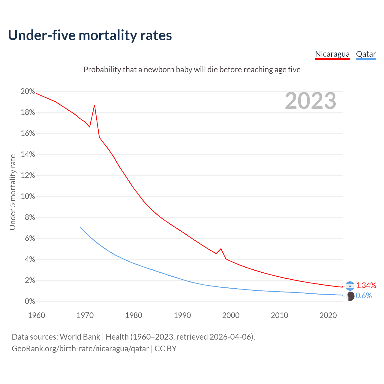 The chance that a newborn baby will die before reaching age five is 1.34% in Nicaragua and 0.6% in Qatar. Above is a chart with historical data on under-five mortality rates.