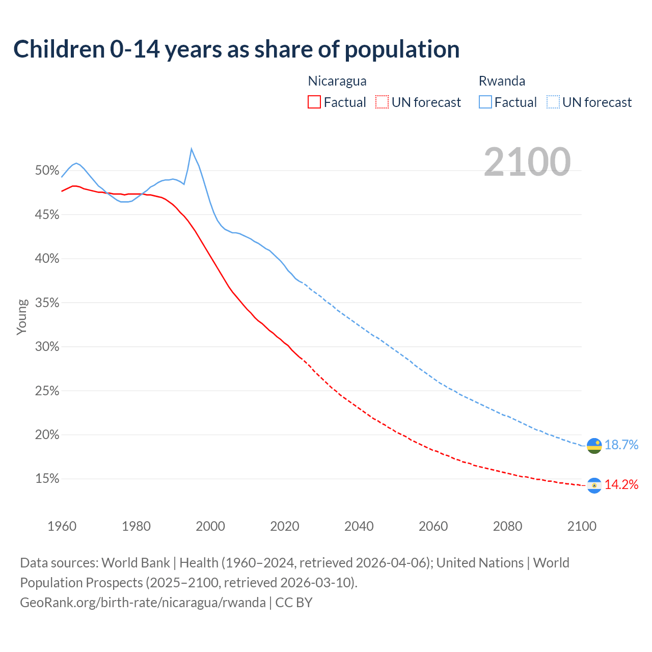 According to the latest available data on birth rates, the fertility rate in Nicaragua was 2.22 children per woman in 2023, compared to 3.7 in Rwanda in 2023. The replacement level is considered to be 2.1 children per woman.