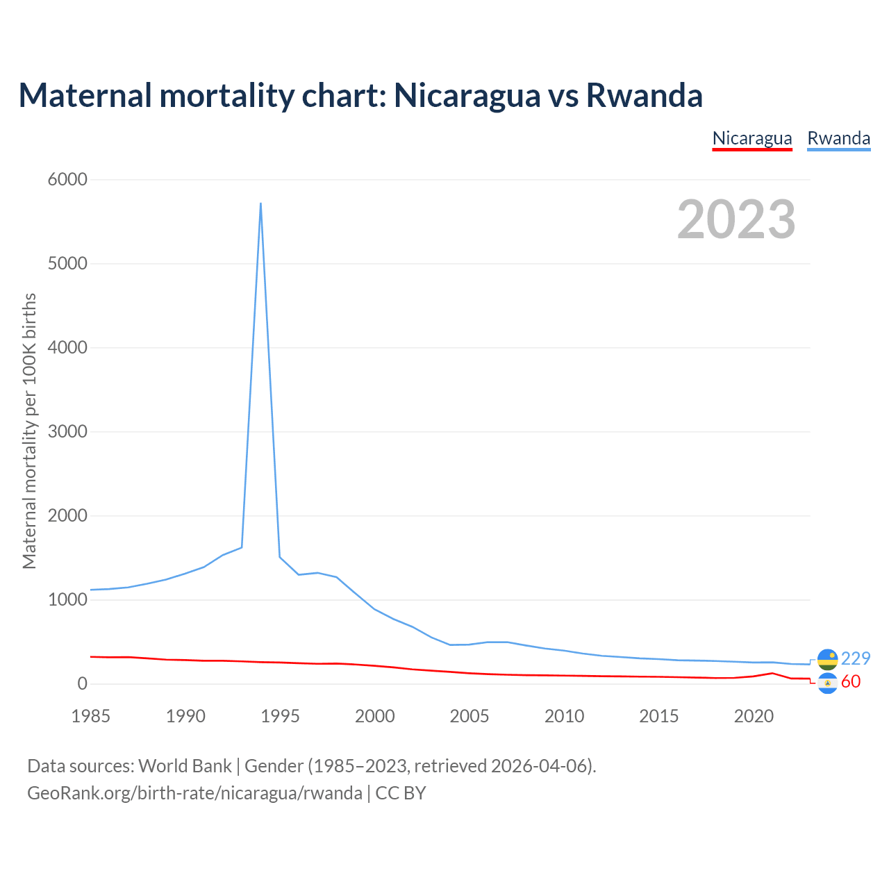 The maternal mortality rate, which is the probability of dying during childbirth or within 42 days of pregnancy termination, is 60 deaths per 100,000 live births in Nicaragua, compared to 229 deaths in Rwanda.