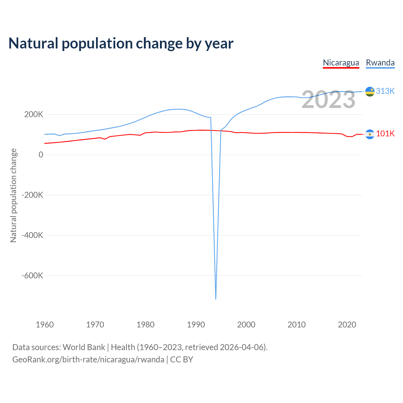 Nicaragua has an annual birth rate of 19.4 births per 1,000 people, compared to 28.3 for Rwanda. The average number of children a woman is expected to have during her lifetime — the fertility rate, is 2.22 in Nicaragua and 3.7 in Rwanda — 66.7% difference.