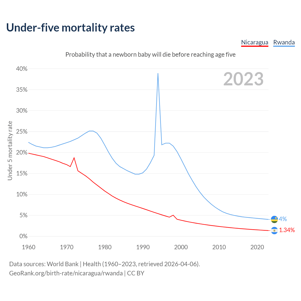 The chance that a newborn baby will die before reaching age five is 1.34% in Nicaragua and 4% in Rwanda. Above is a chart with historical data on under-five mortality rates.