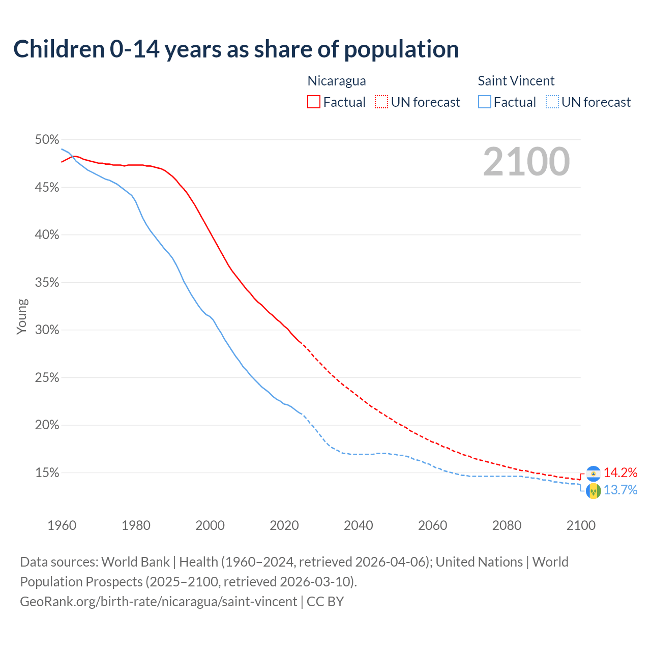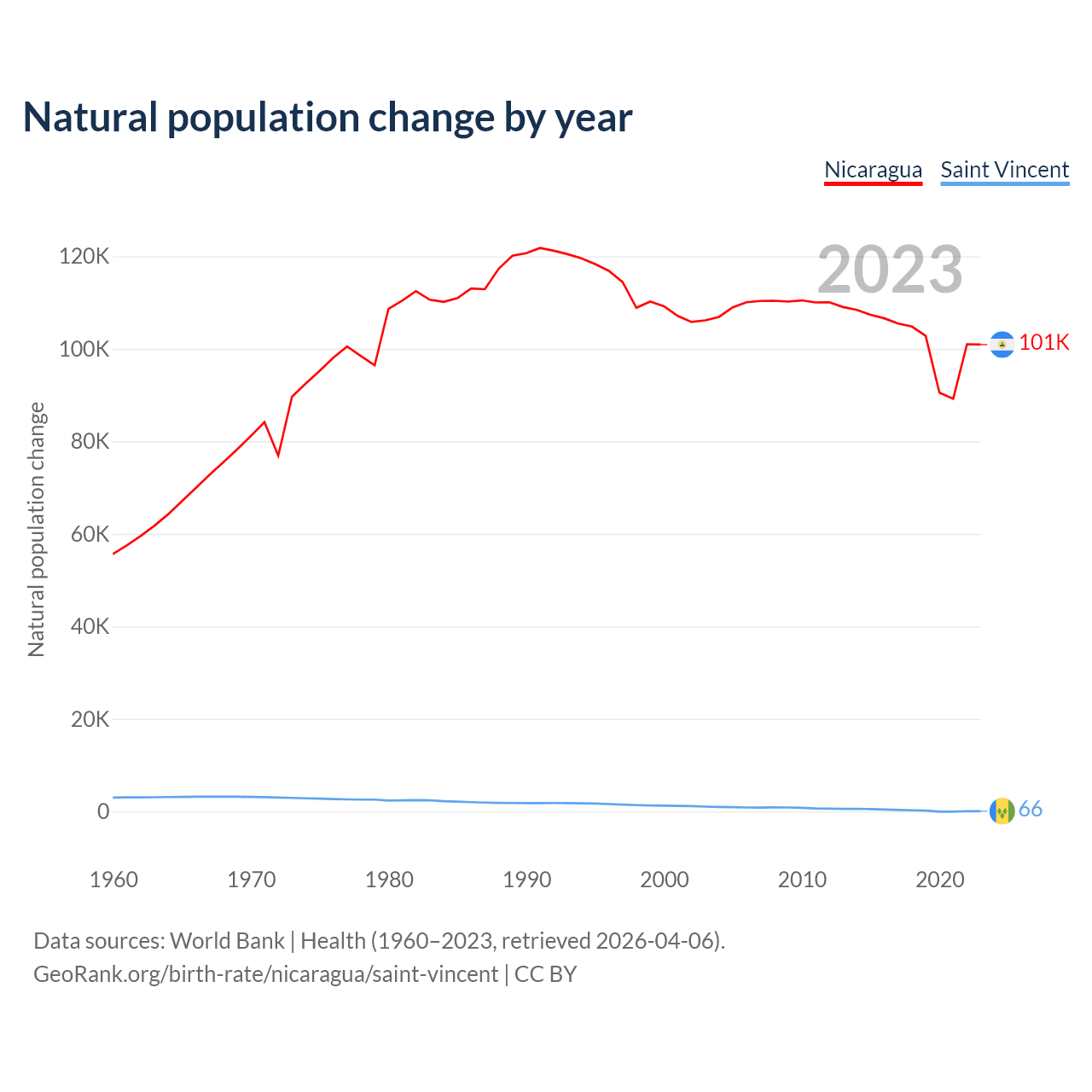 Nicaragua has an annual birth rate of 19.4 births per 1,000 people, compared to 12.2 for Saint Vincent. The average number of children a woman is expected to have during her lifetime — the fertility rate, is 2.22 in Nicaragua and 1.78 in Saint Vincent — 20% difference.
