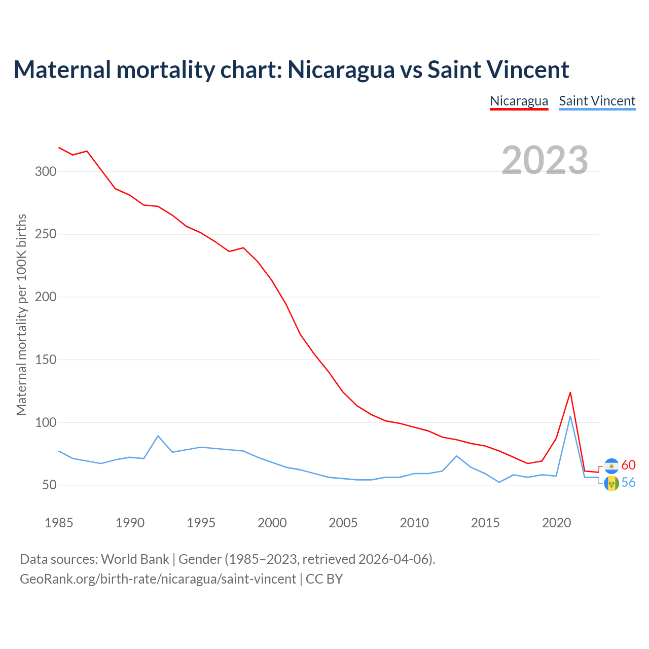 The maternal mortality rate, which is the probability of dying during childbirth or within 42 days of pregnancy termination, is 60 deaths per 100,000 live births in Nicaragua, compared to 56 deaths in Saint Vincent.