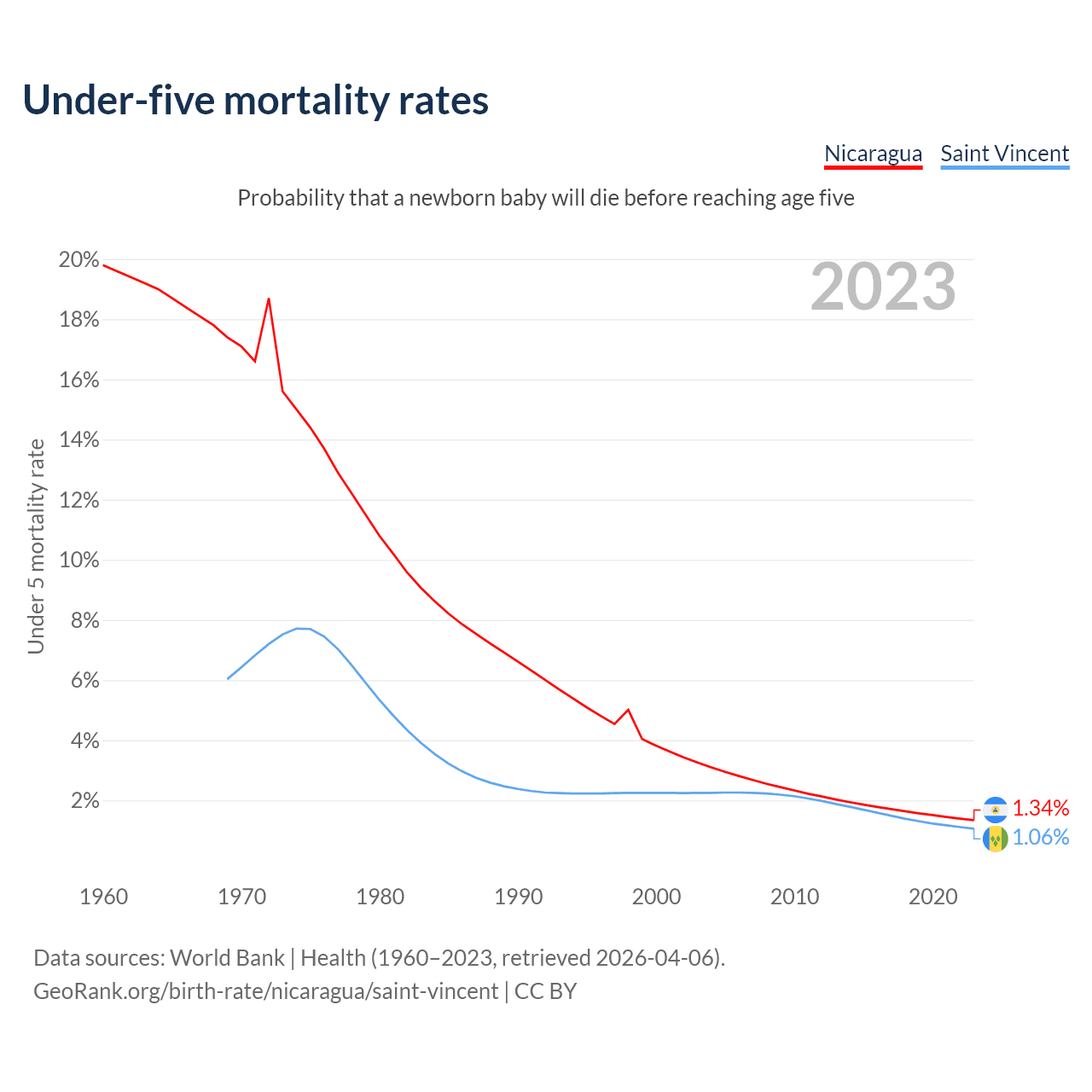 The chance that a newborn baby will die before reaching age five is 1.34% in Nicaragua and 1.06% in Saint Vincent. Above is a chart with historical data on under-five mortality rates.