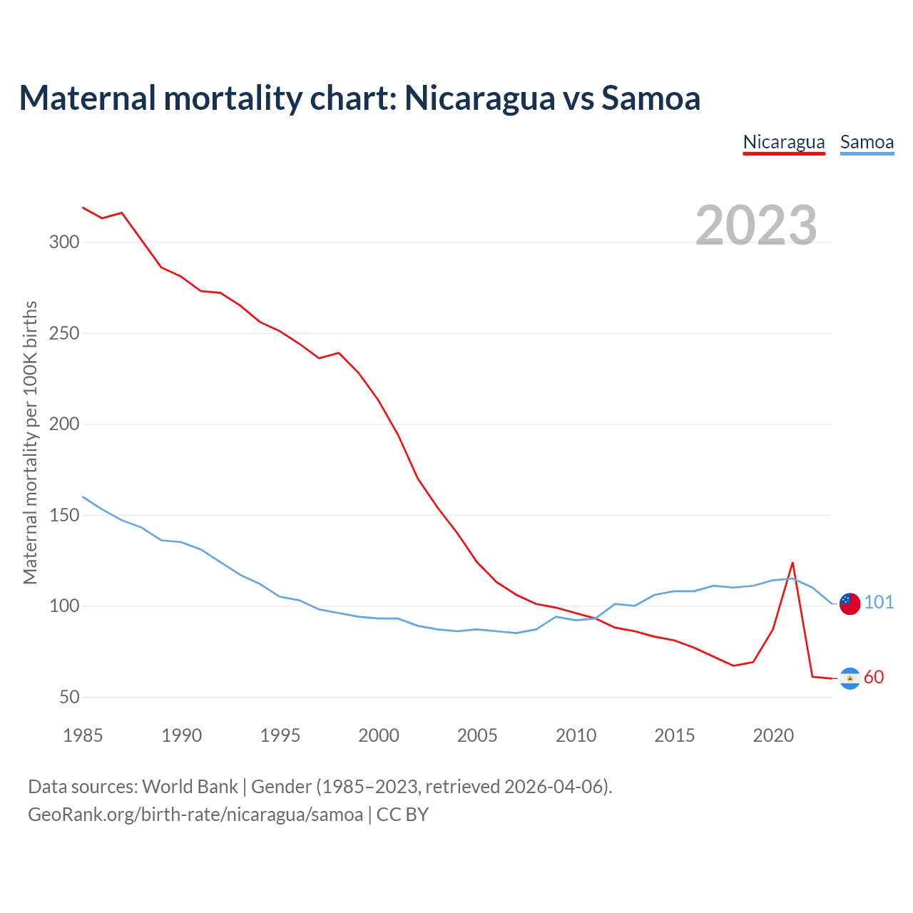 The maternal mortality rate, which is the probability of dying during childbirth or within 42 days of pregnancy termination, is 60 deaths per 100,000 live births in Nicaragua, compared to 101 deaths in Samoa.