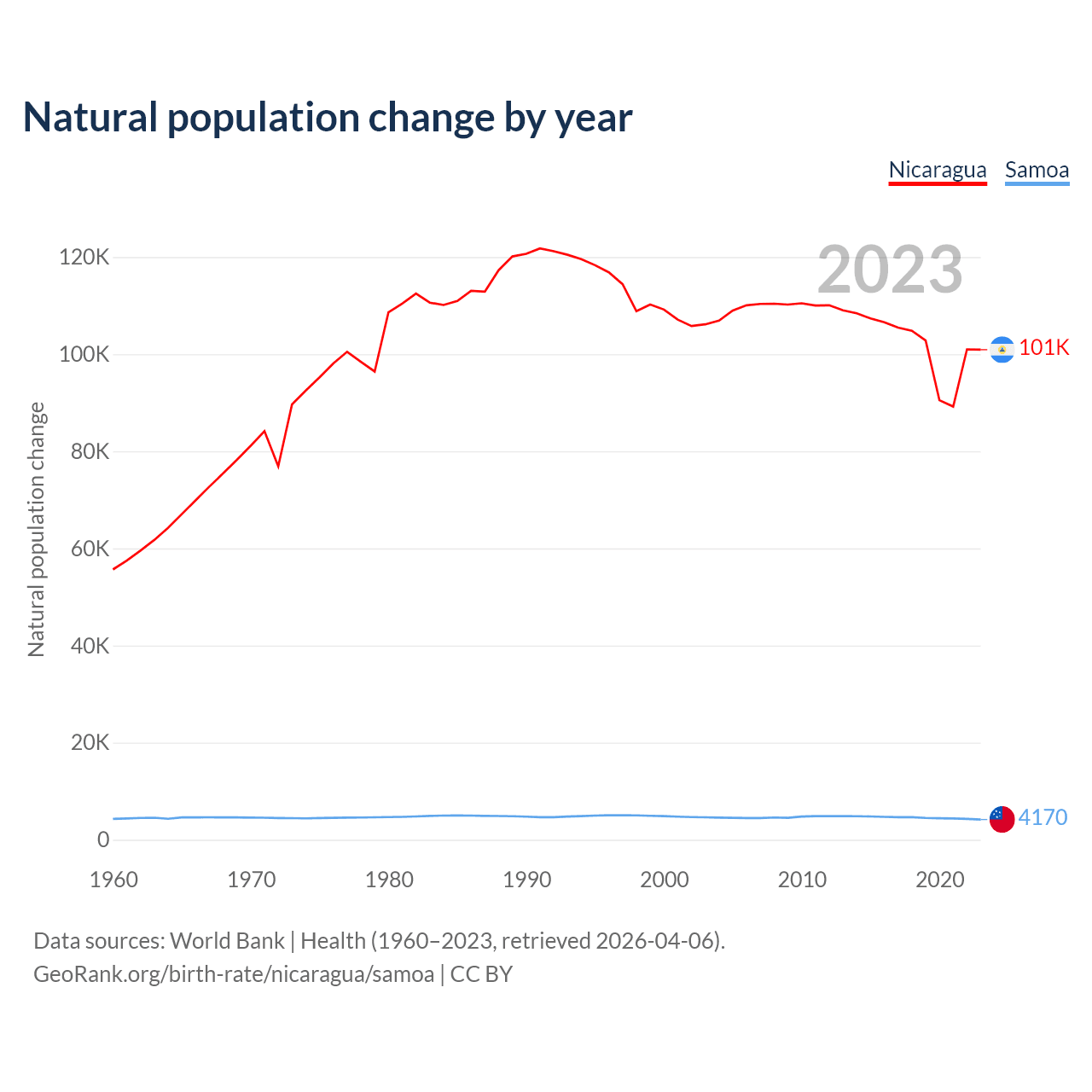 Nicaragua has an annual birth rate of 19.4 births per 1,000 people, compared to 25.4 for Samoa. The average number of children a woman is expected to have during her lifetime — the fertility rate, is 2.22 in Nicaragua and 3.83 in Samoa — 72.6% difference.