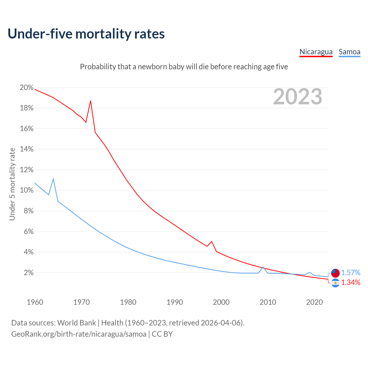 The chance that a newborn baby will die before reaching age five is 1.34% in Nicaragua and 1.57% in Samoa. Above is a chart with historical data on under-five mortality rates.