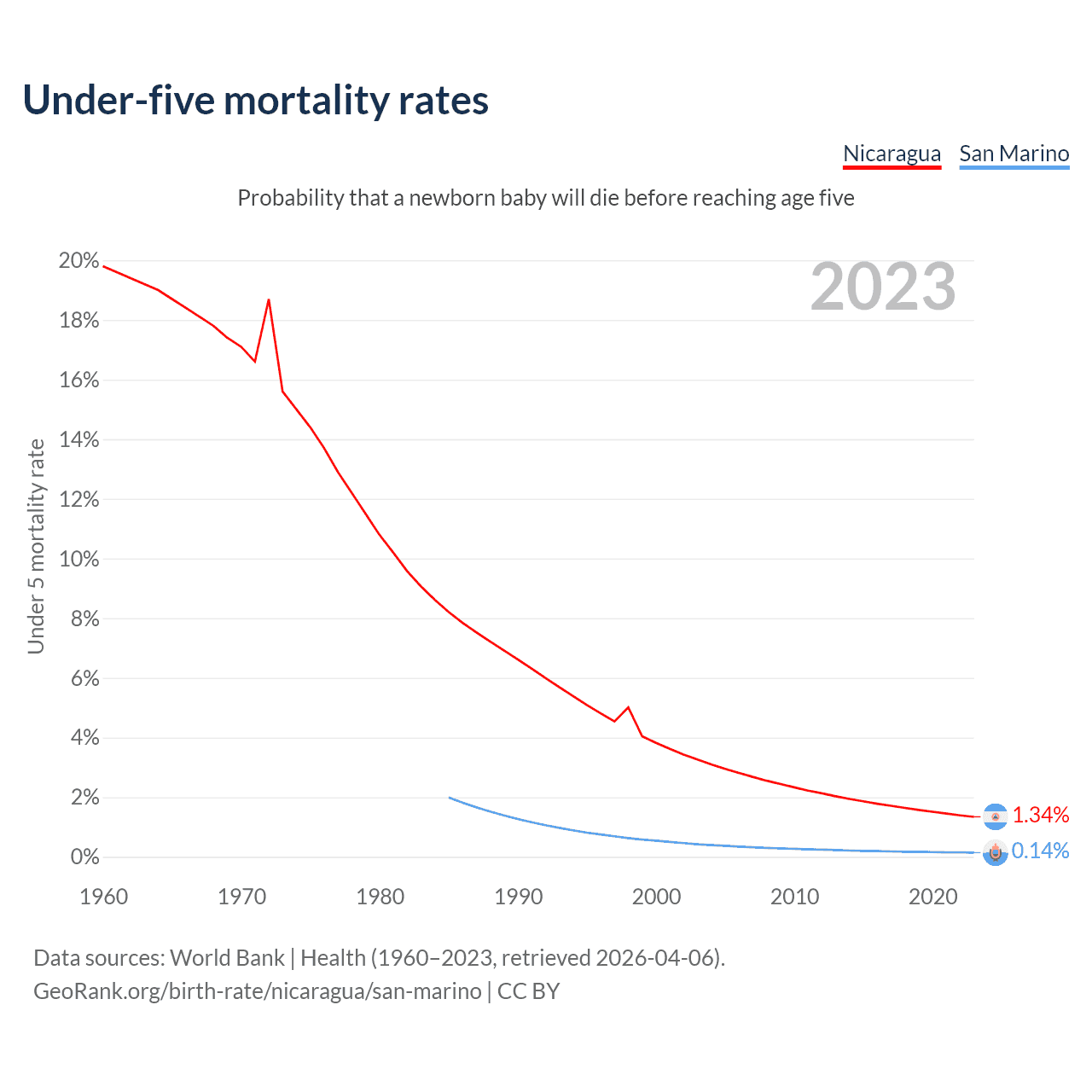 The chance that a newborn baby will die before reaching age five is 1.34% in Nicaragua and 0.14% in San Marino. Above is a chart with historical data on under-five mortality rates.