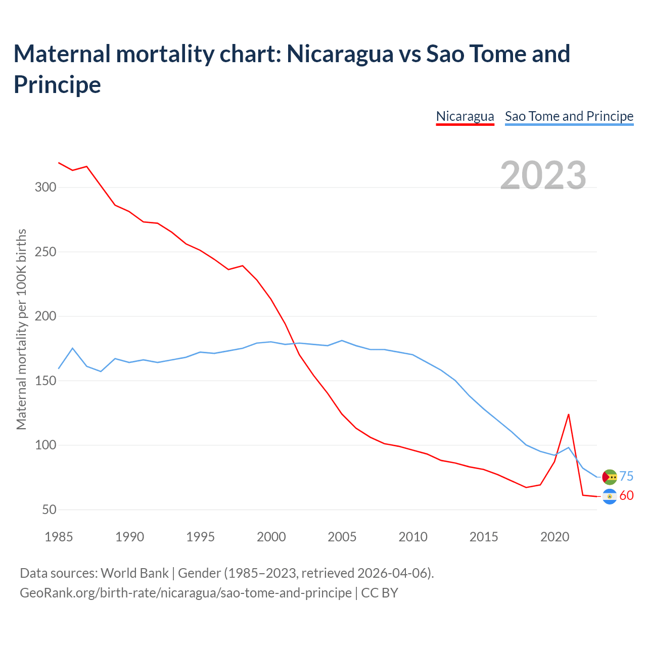 The maternal mortality rate, which is the probability of dying during childbirth or within 42 days of pregnancy termination, is 60 deaths per 100,000 live births in Nicaragua, compared to 75 deaths in Sao Tome and Principe.