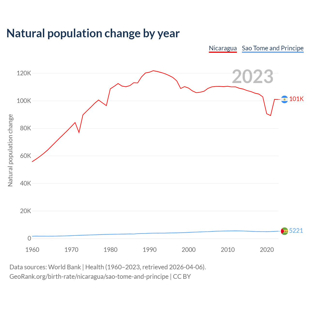 Check Nicaragua vs Sao Tome and Principe population clock for a dynamic visualization of the changing population.