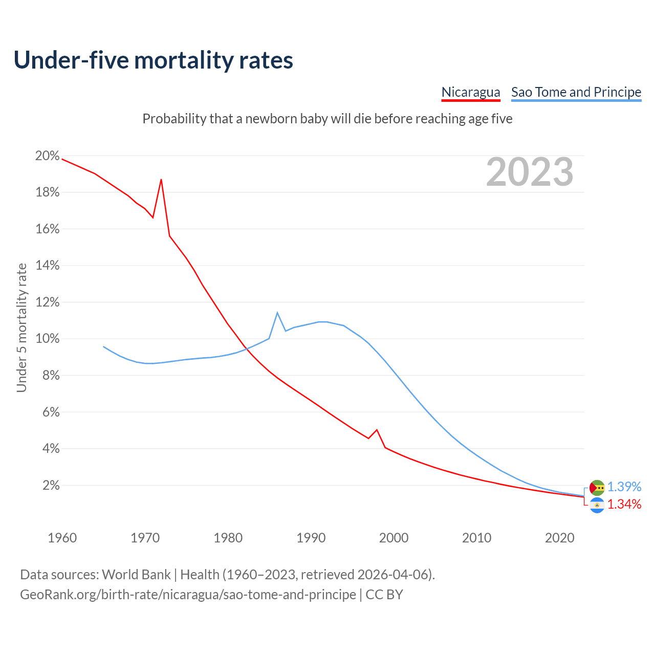The chance that a newborn baby will die before reaching age five is 1.34% in Nicaragua and 1.39% in Sao Tome and Principe. Above is a chart with historical data on under-five mortality rates.