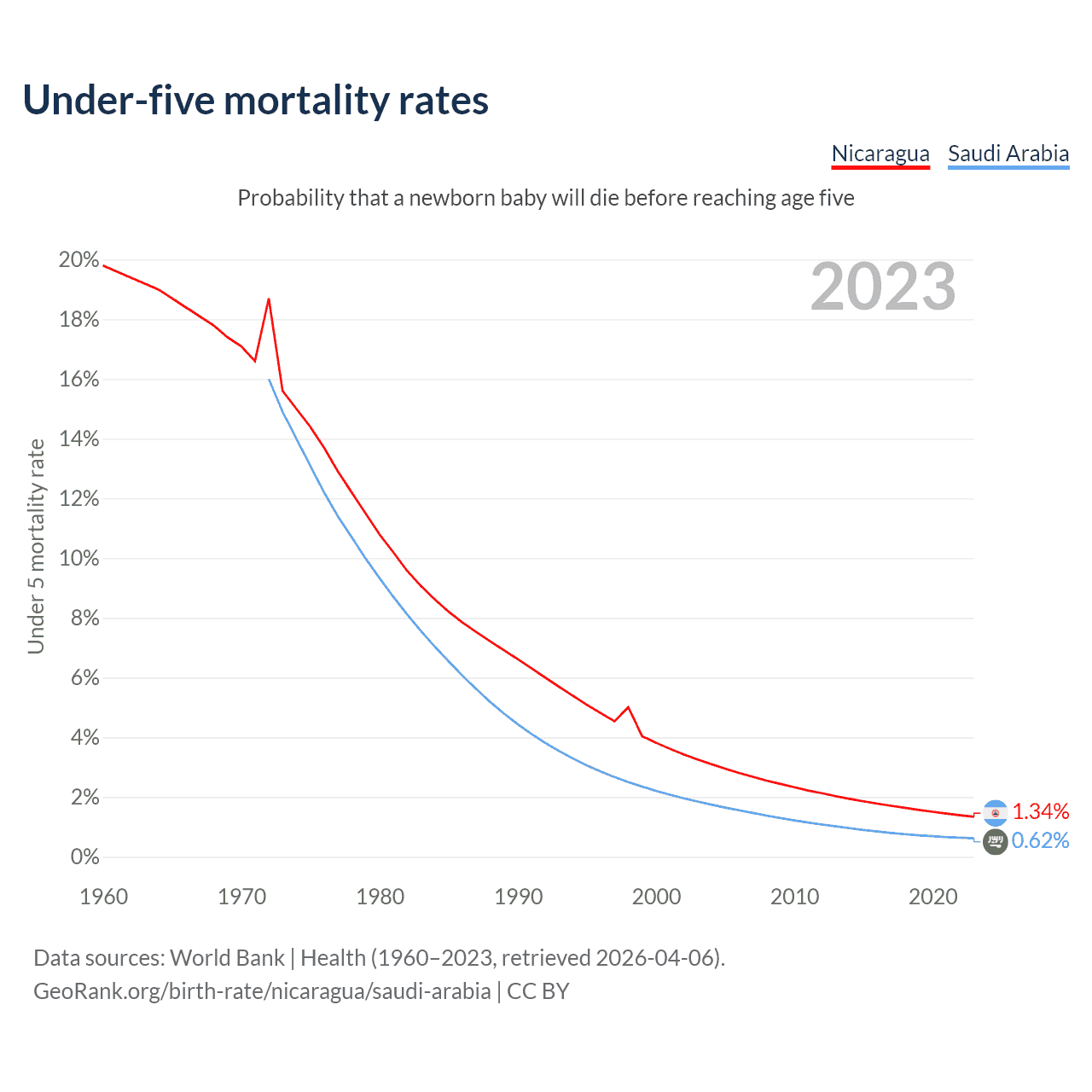 The chance that a newborn baby will die before reaching age five is 1.34% in Nicaragua and 0.62% in Saudi Arabia. Above is a chart with historical data on under-five mortality rates.
