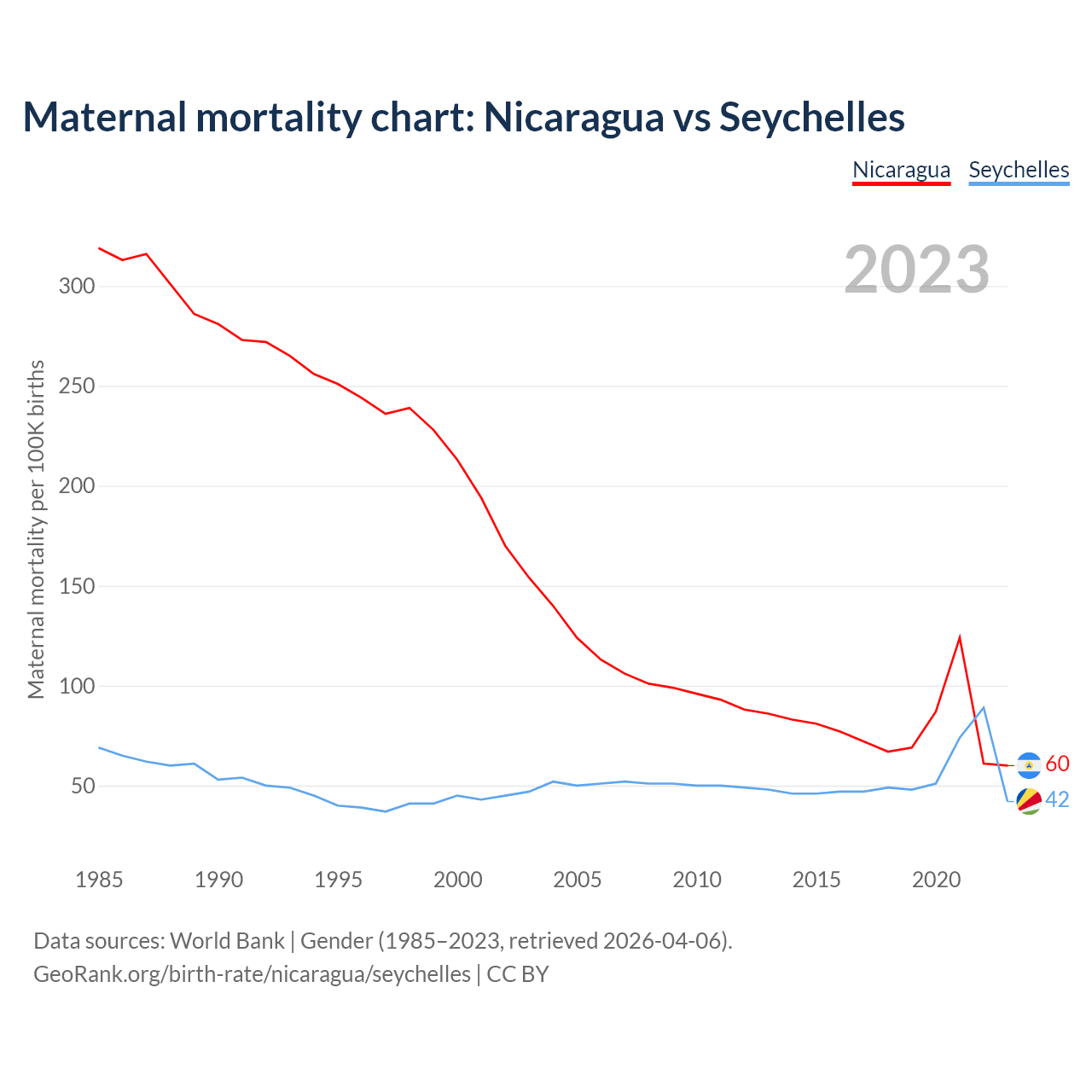 The maternal mortality rate, which is the probability of dying during childbirth or within 42 days of pregnancy termination, is 60 deaths per 100,000 live births in Nicaragua, compared to 42 deaths in the Seychelles.